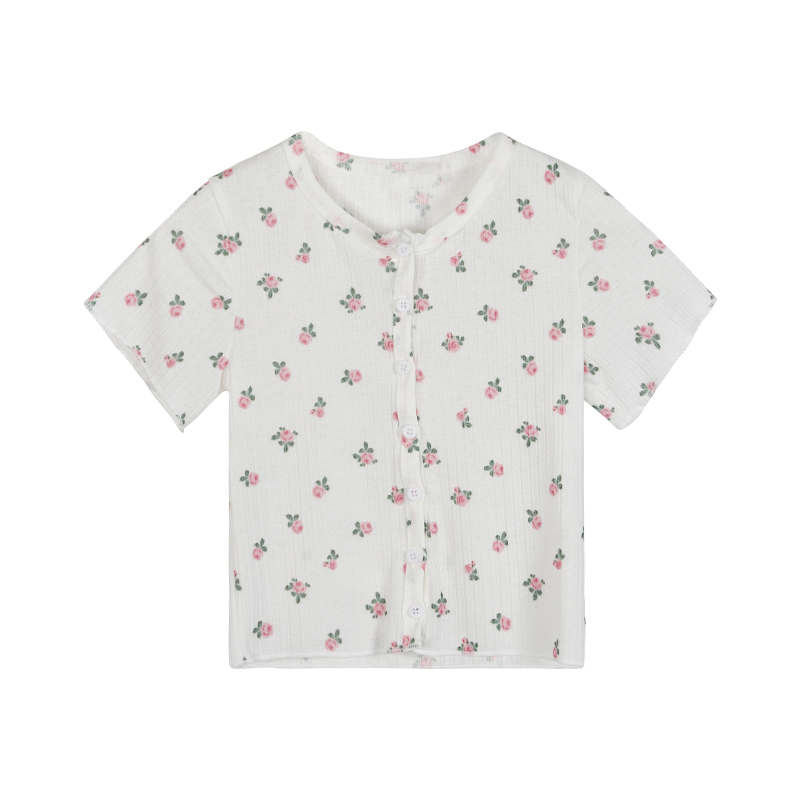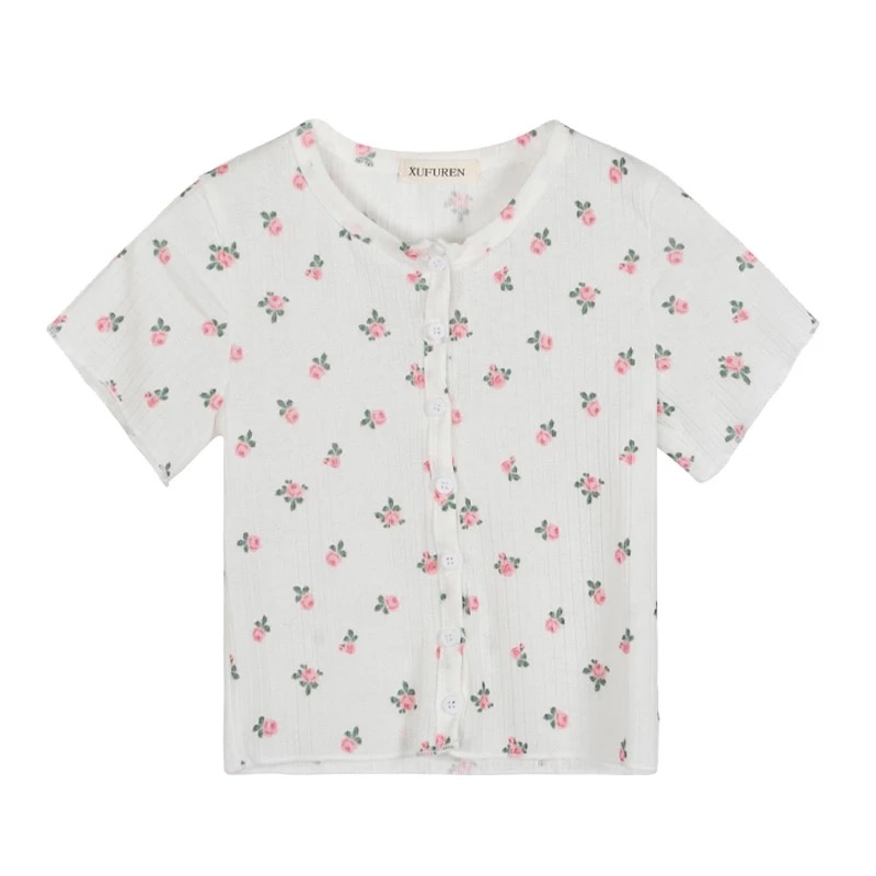 Cute Flower Rose Button Up Crop Top Short Sleeve Shirt T-shirt Tee Top Kawaii Korean Japanese Harajuku Chinese Retro Streetwear Aesthetic Fashion