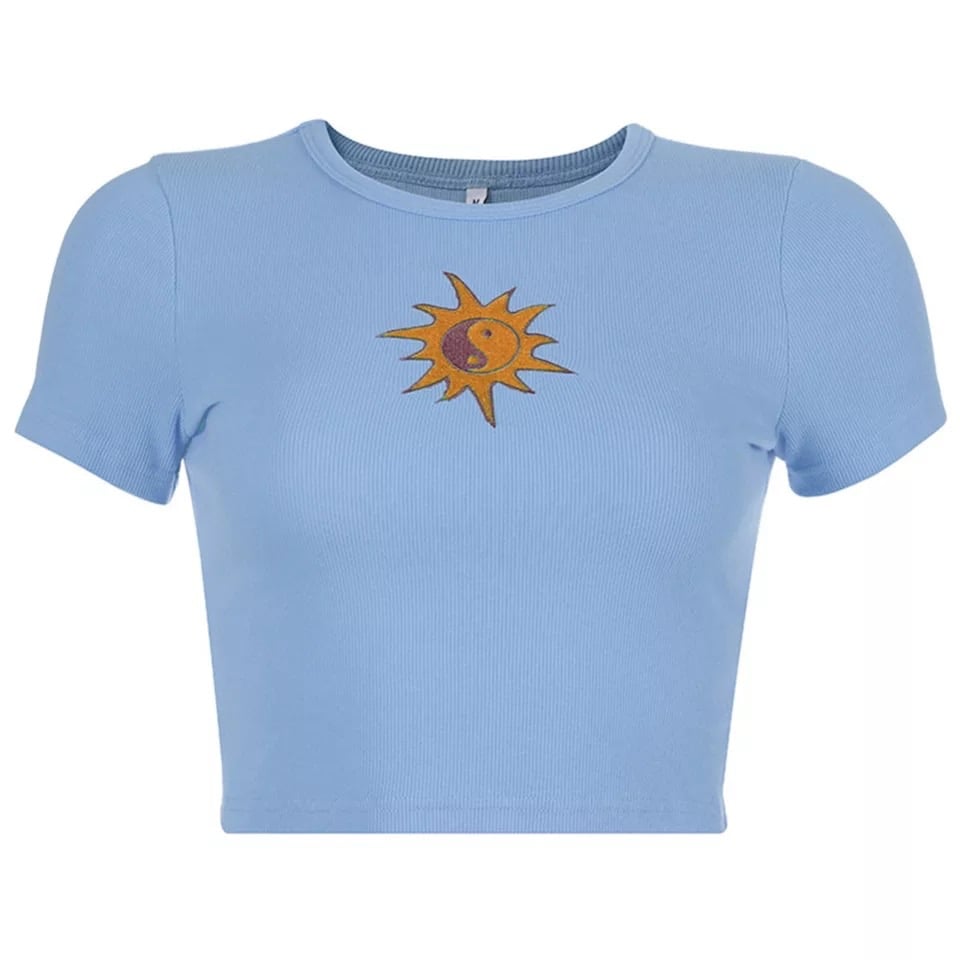 Cute Ying Yang Sun Embroidery Short Sleeve Shirt Crop Top Tee T-shirt E-Girl Kawaii Korean Japanese Harajuku Chinese Retro Streetwear Aesthetic
