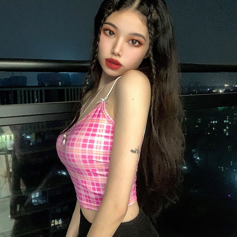 Cute Sexy Pink Checkered Plaid Tank Cami Crop Top Shirt Tee T-shirt E-Girl Kawaii Korean Japanese Harajuku Chinese Retro Streetwear Aesthetic