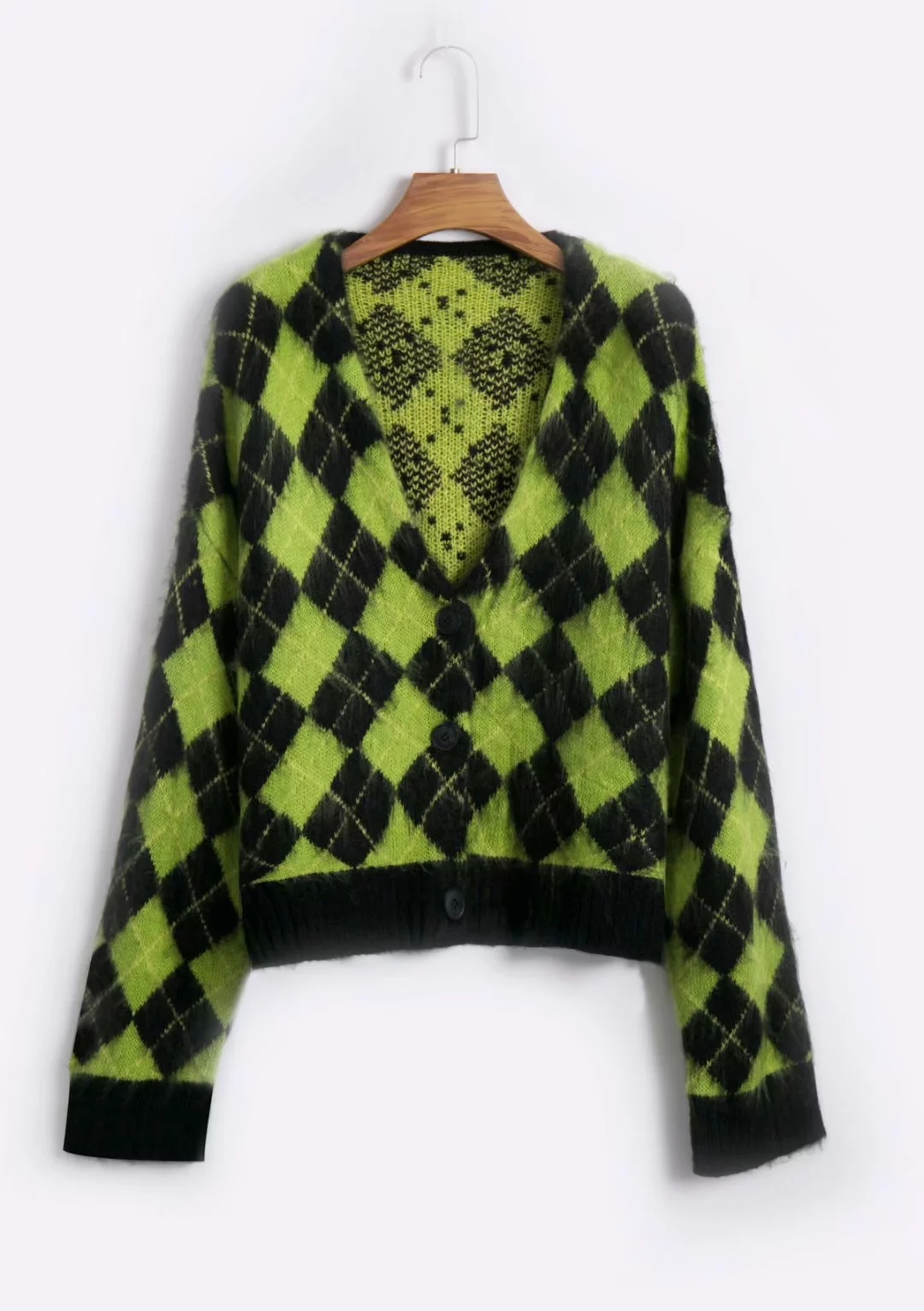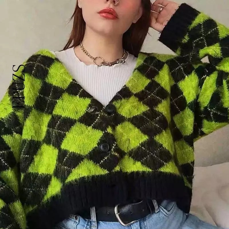 Cute Checkered Vintage Knit Cardigan Sweater Top Shirt Winter Autumn E-Girl Kawaii Korean Japanese Harajuku Chinese Retro Streetwear