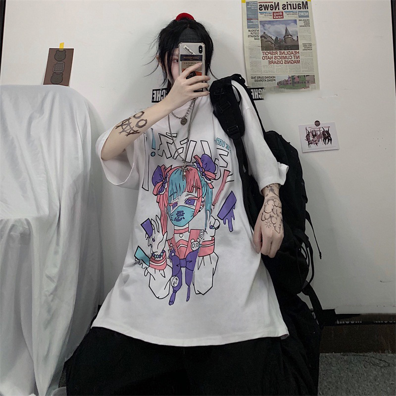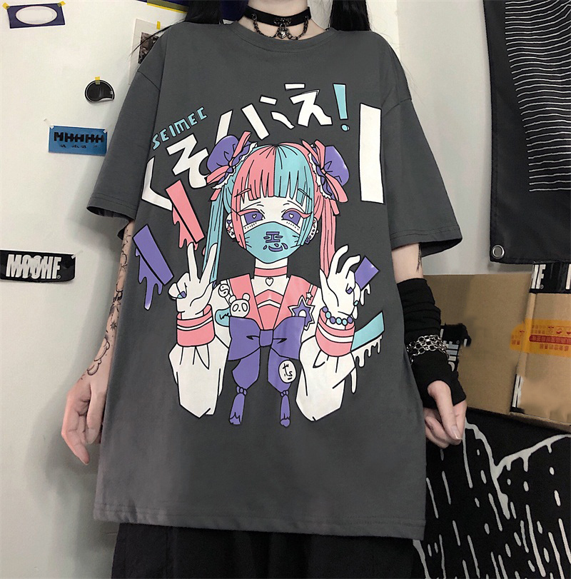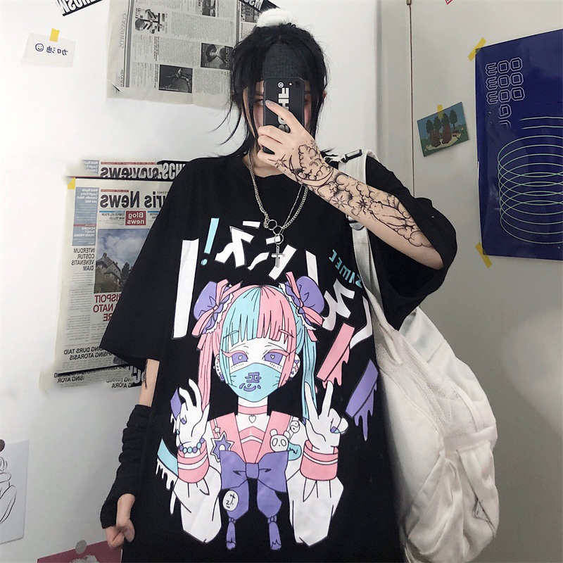 Cute Japanese Girl Punk Goth Print Oversized Short Sleeve Shirt Tee T-shirt E-Girl Kawaii Korean Japanese Harajuku Retro Streetwear Aesthetic
