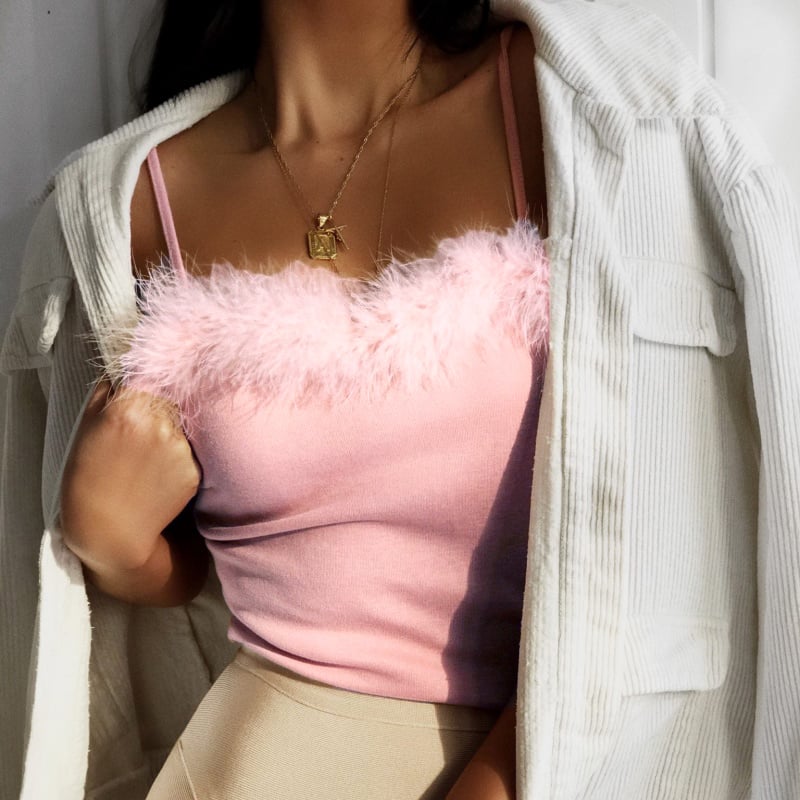 Cute Sexy Pink Lace Up Fluffy Fur Crop Top Camisole Tank Spaghetti T-shirt Tee Shirt E-Girl Kawaii Korean Japanese Harajuku Retro Streetwear Fashion