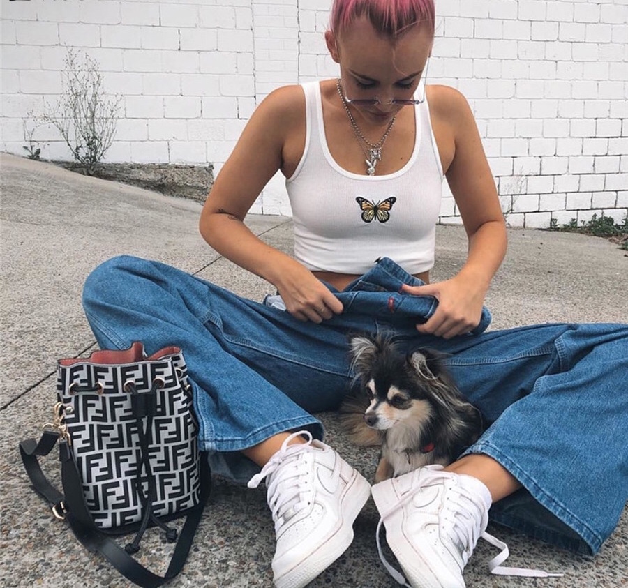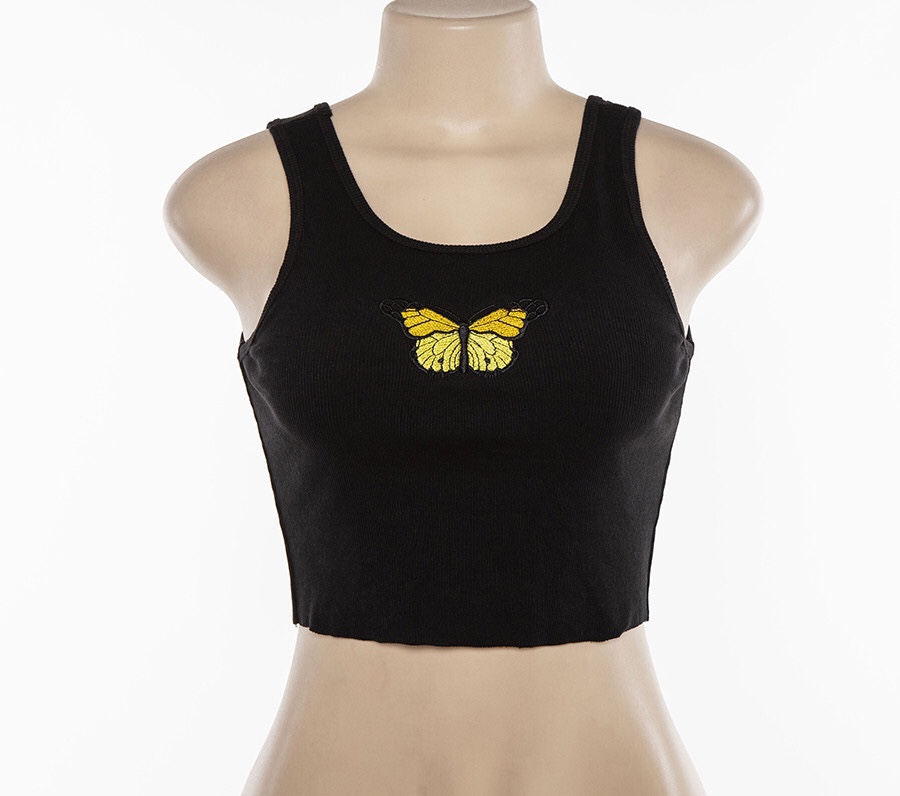 Sexy White Butterfly Embroidery Crop Top Camisole Tank Sleeveless T-shirt Tee Shirt E-Girl Kawaii Korean Japanese Harajuku Retro Streetwear Fashion
