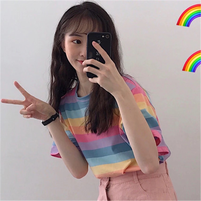 Cute Causal Pastel Rainbow Colorful Stripe Loose Round Neck Short Sleeve Tee Shirt T-shirt Top E-Girl Kawaii Korean Japanese Harajuku Retro Streetwear