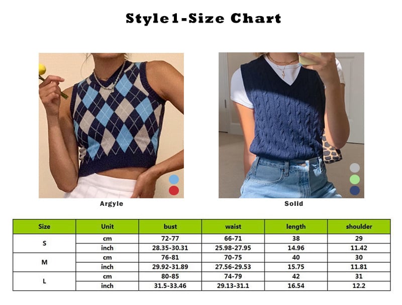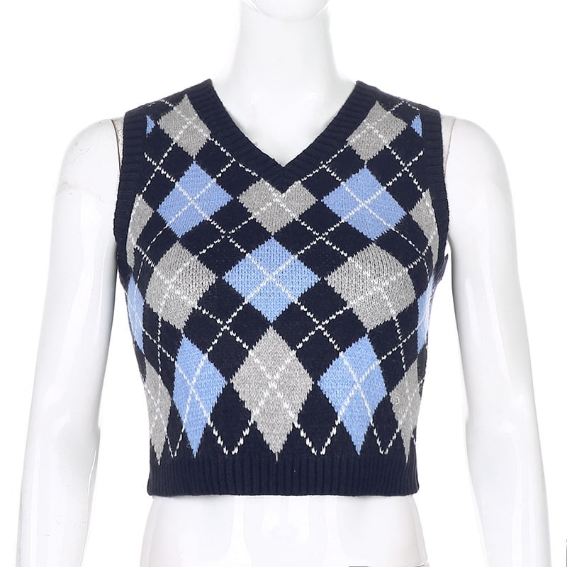 Vintage Plaid V Neck Sleeveless Sweater Vest Knit Crop Top Preppy Causal Pullover E-Girl Kawaii Korean Japanese Harajuku Streetwear
