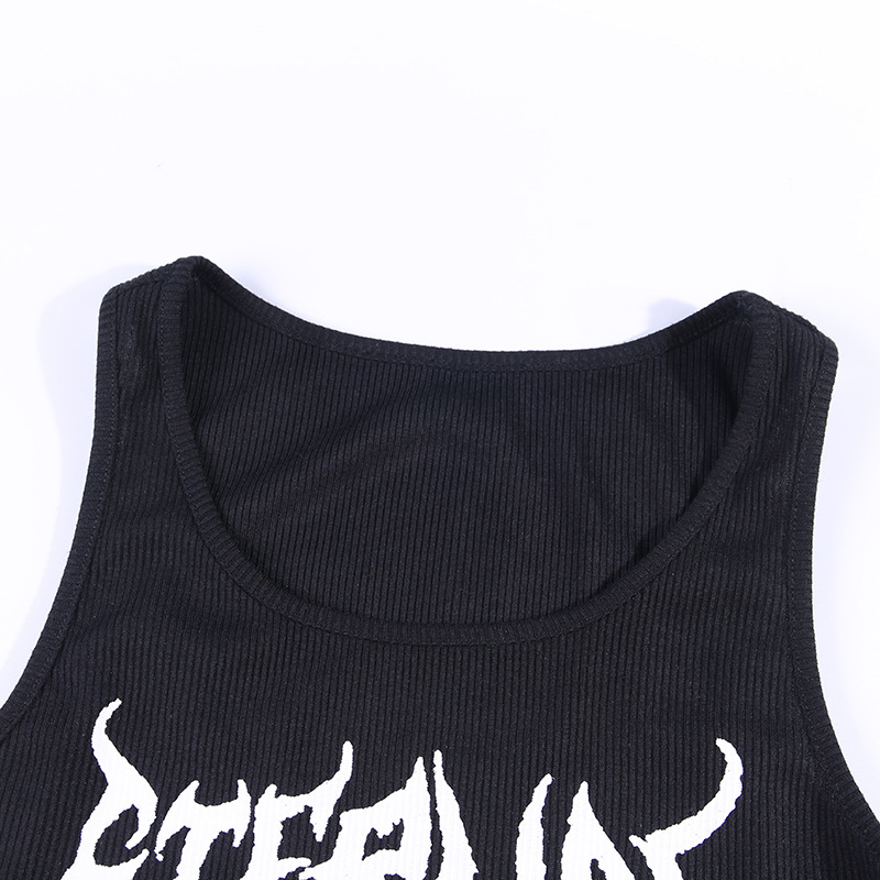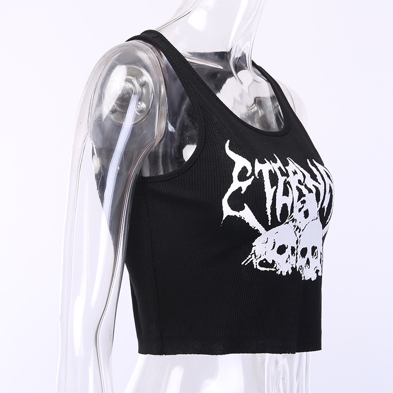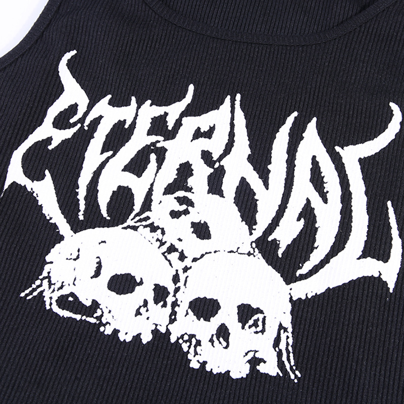 Black Skull Print Knit Ruffle Tank Top Cropped Sleeveless Shirt Causal Goth Punk Causal Summer E-Girl Kawaii Korean Japanese Harajuku Streetwear