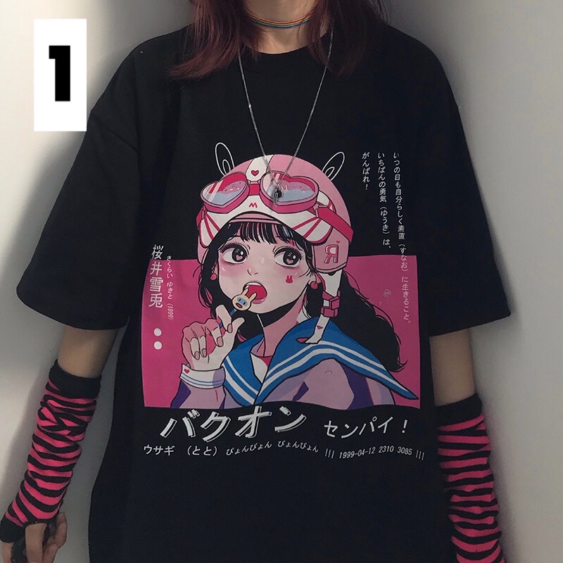 Anime Girl Cartoon Print Aesthetic Loose Short Sleeve Shirt T-shirt Top Punk Goth Summer Casual E-Girl Kawaii Korean Japanese Harajuku Streetwear