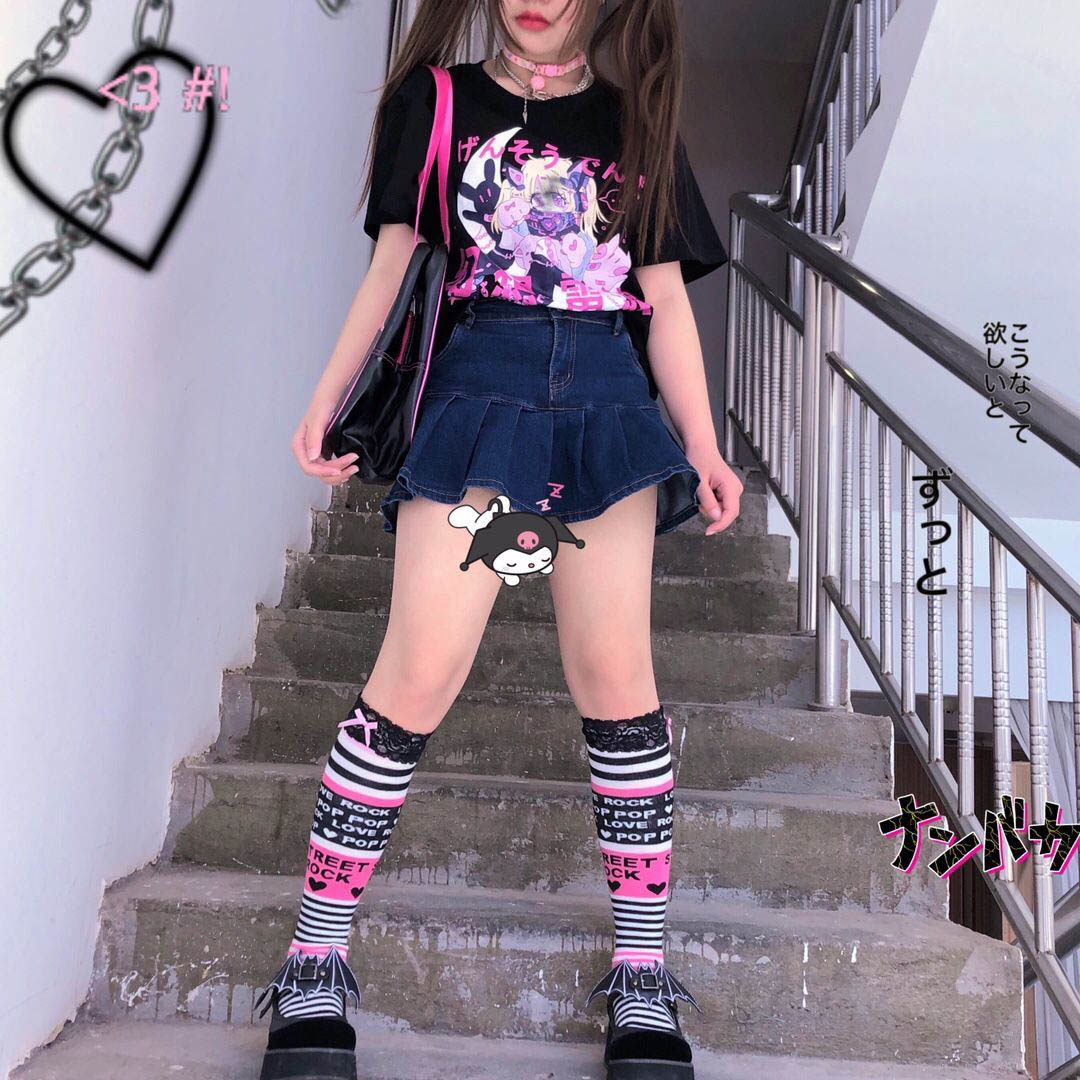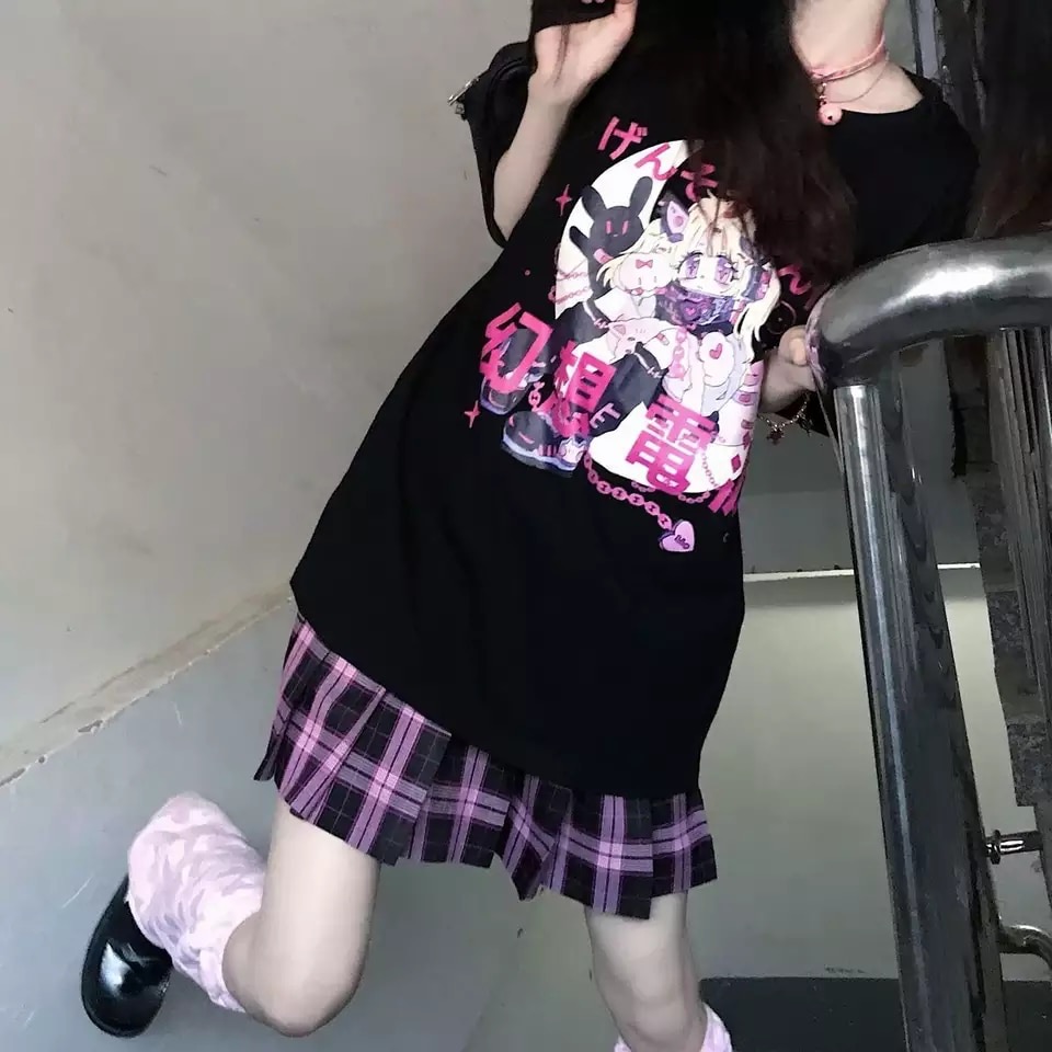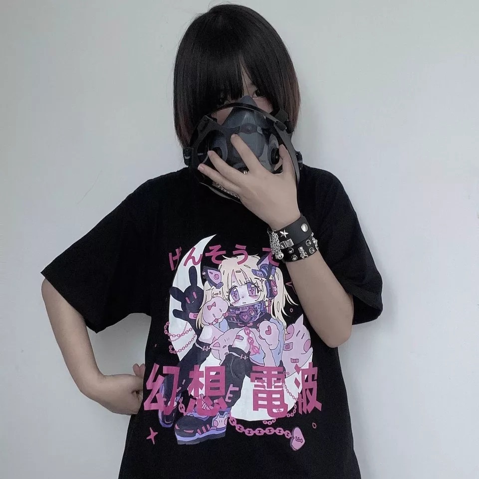 Anime Cartoon Print Grunge Loose Steampunk Goth Punk Short Sleeve Shirt T-shirt Top Summer Causal E-Girl Kawaii Korean Japanese Harajuku Streetwear