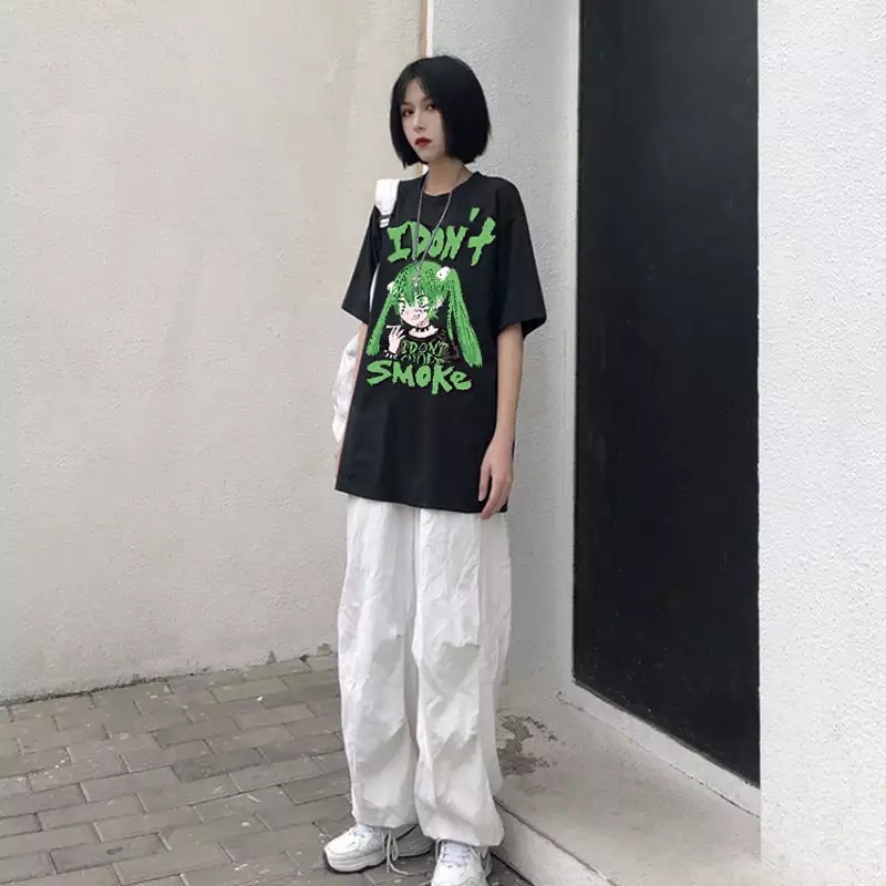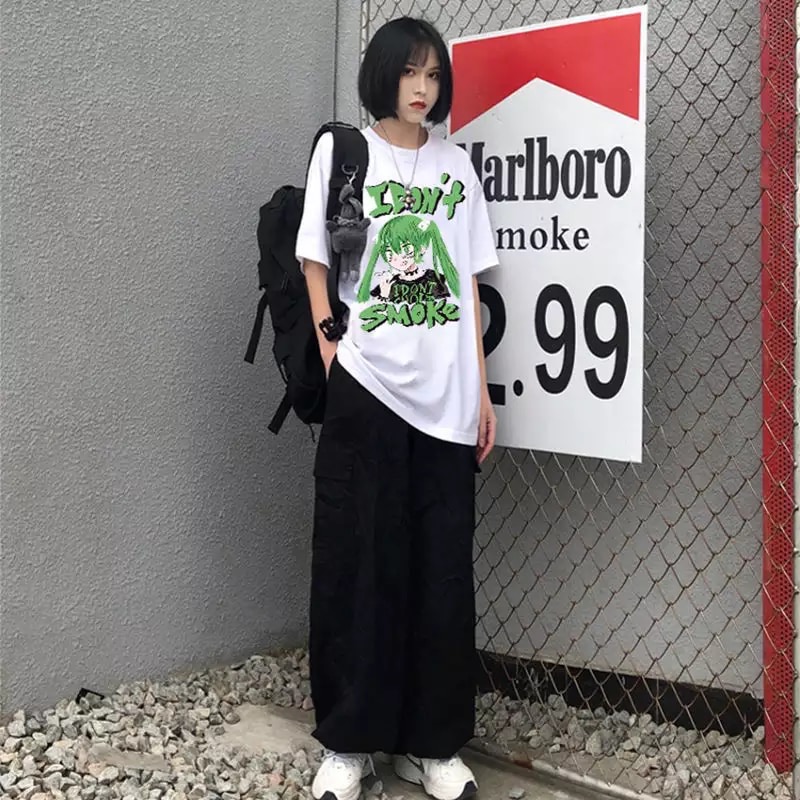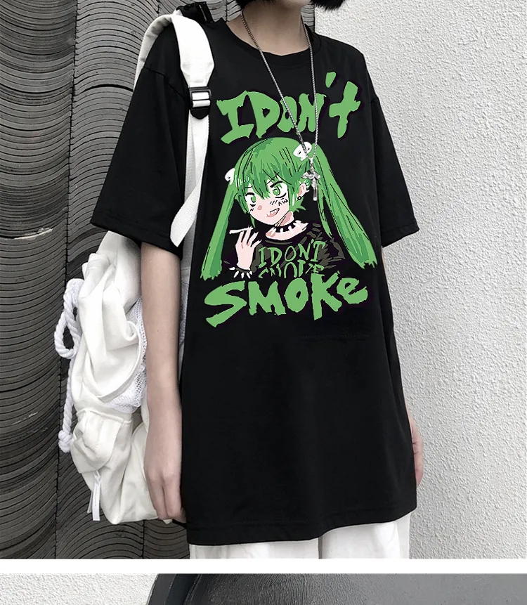 Anime Girl Smoke Cartoon Print Loose Oversized Short Sleeve T-shirt Top Summer Causal Goth Punk E-Girl Kawaii Korean Japanese Harajuku Streetwear