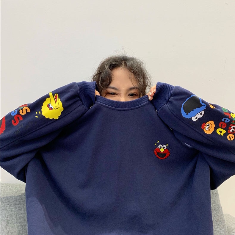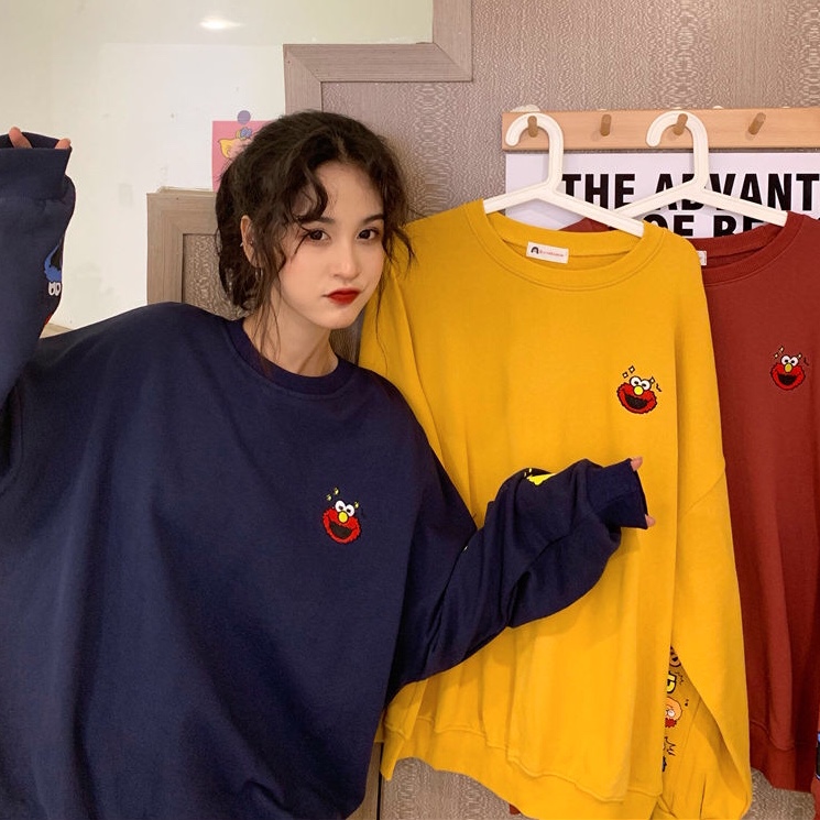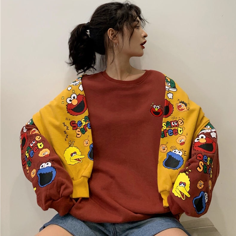 Funny Elmo Cartoon Print Loose Oversized Long Sleeve Sweatshirt Sweater Pullover Jumper Causal E-Girl Kawaii Korean Japanese Harajuku Streetwear
