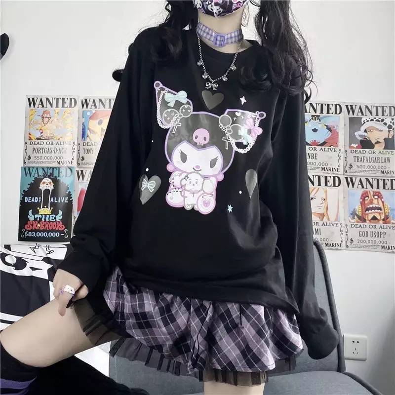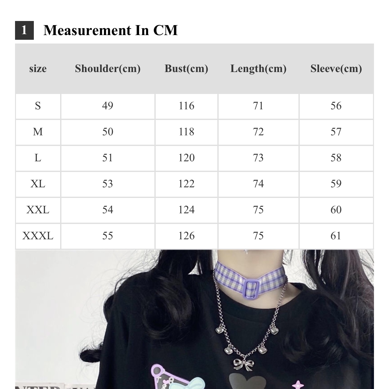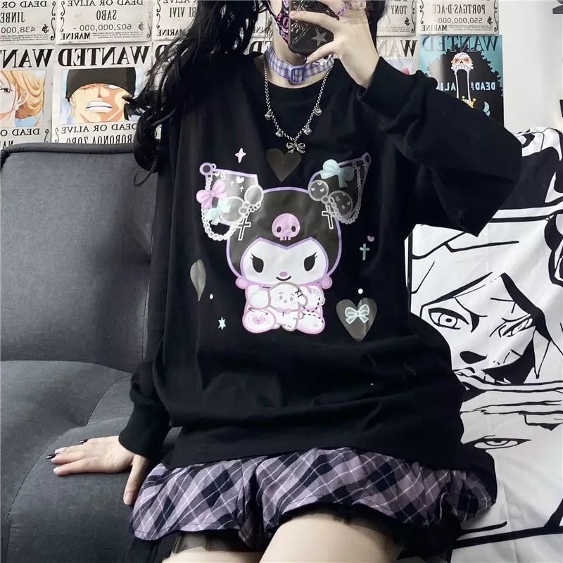 Cute Black Japanese Anime Cartoon Print Loose Oversize Long Sleeve T-shirt