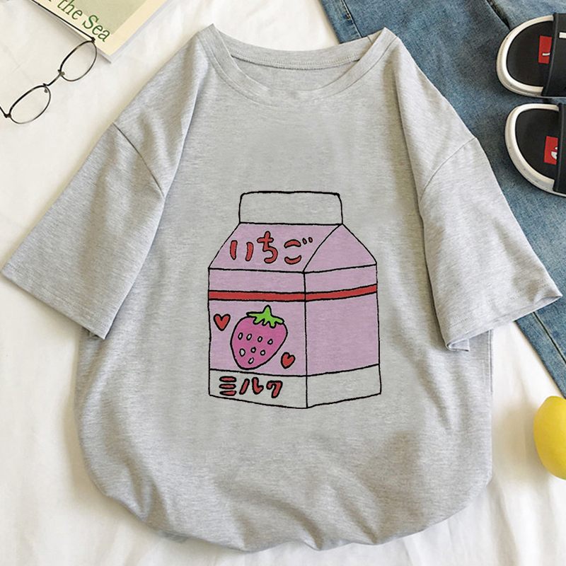 Cute Pink Peach Milk Carton Box Graphic Cartoon Print Loose Short Sleeve Short T-shirt Top Casual E-Girl Kawaii Korean Japanese Harajuku Streetwear