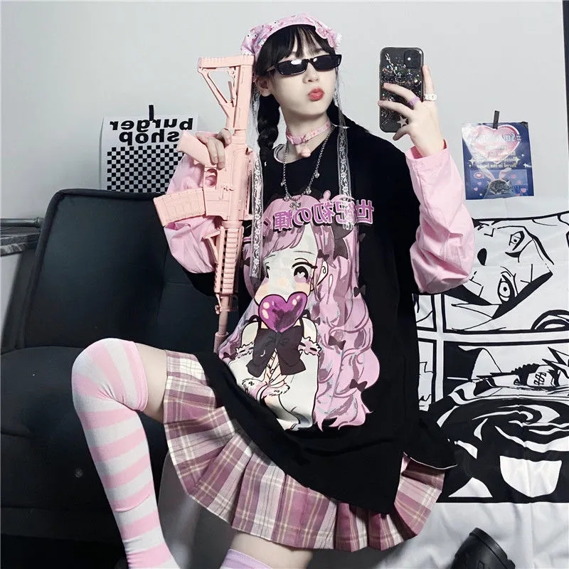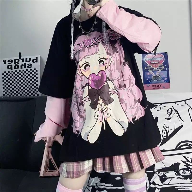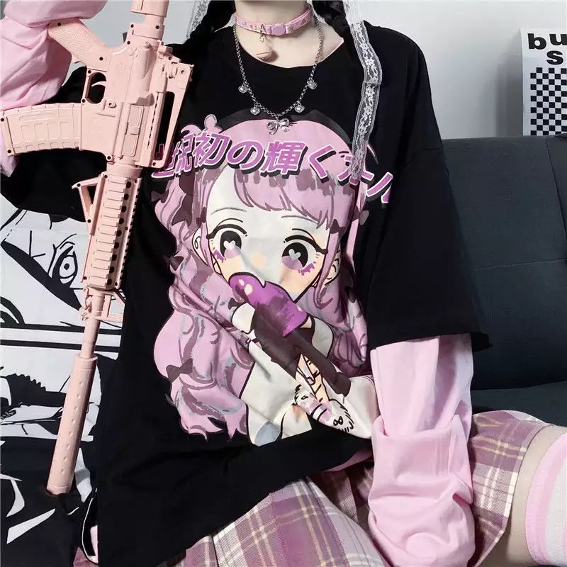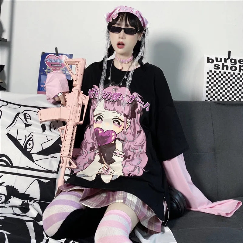 Cute Aesthetic Black Anime Girl Cartoon Print Short Sleeve Shirt Oversized Loose T-shirt Top Goth E-Girl Kawaii Korean Japanese Harajuku Streetwear