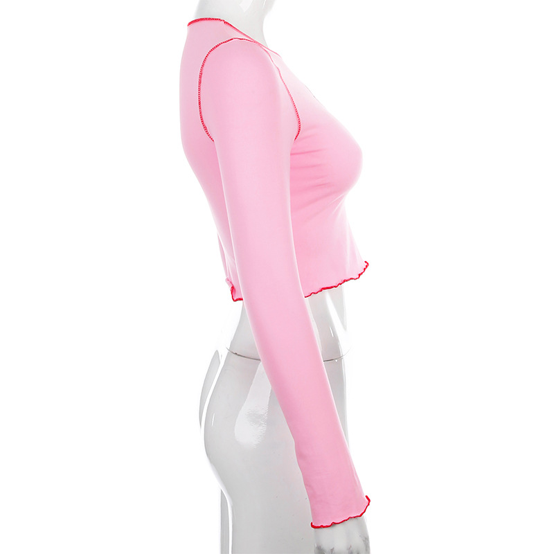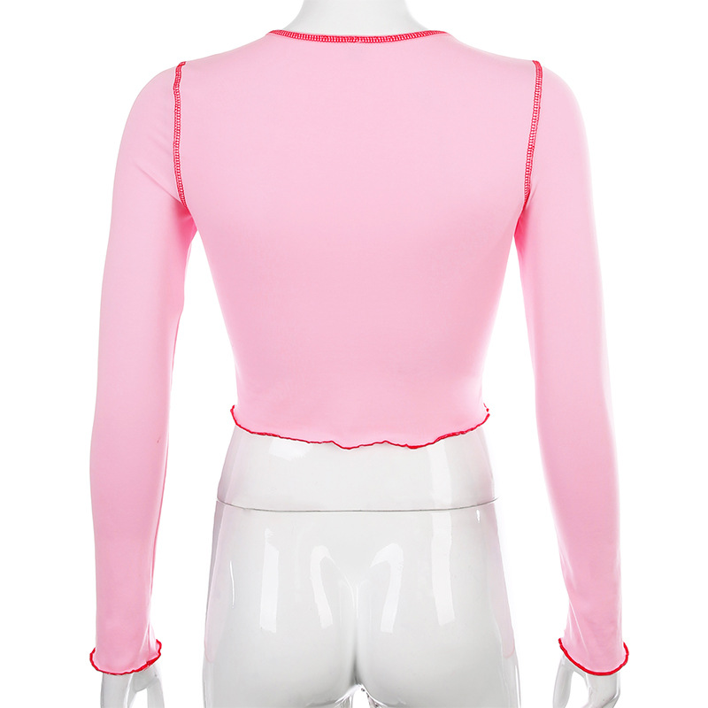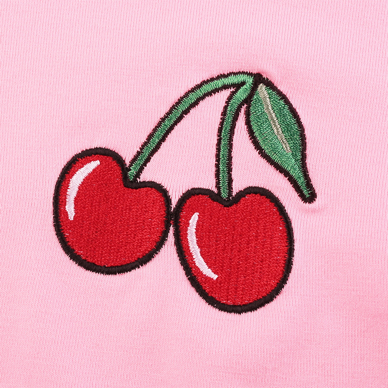 Cute Pink Cherry Fruit Embroidery Crop Top Long Sleeve Shirt T-shirt Causal Tee Summer E-Girl Kawaii Korean Japanese Harajuku Streetwear