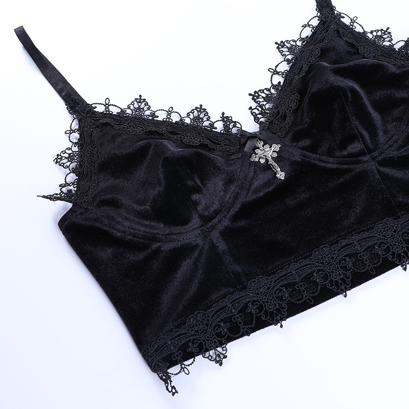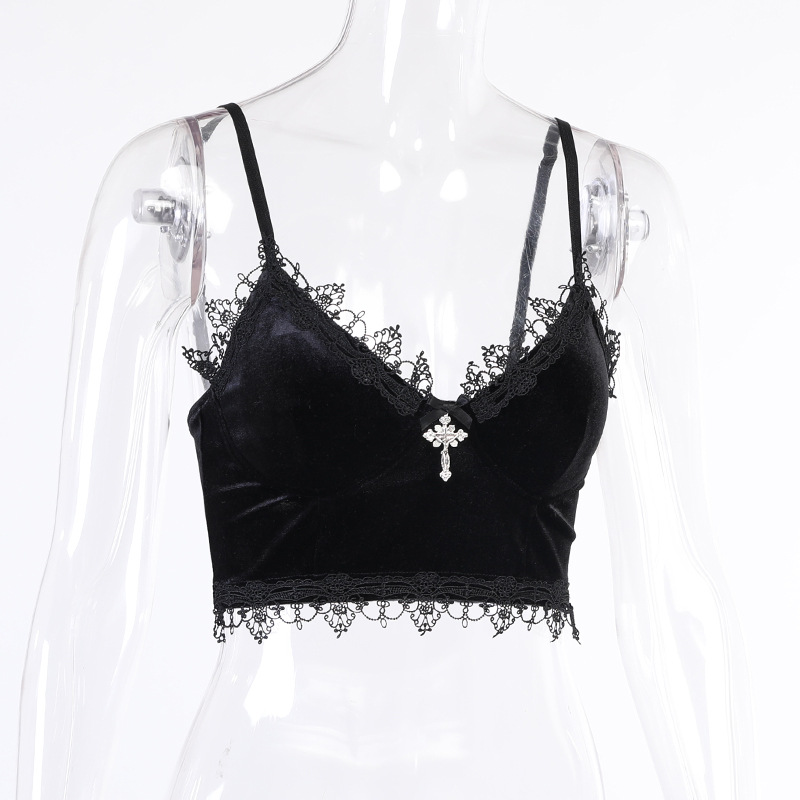 Cute Sexy Black Lace Trim Cross Goth Punk Backless Crop Top Tank Sleeveless Shirt Summer Casual E-Girl Kawaii Korean Japanese Harajuku Streetwear
