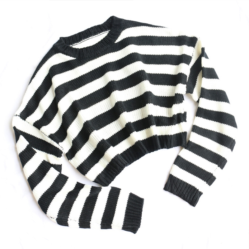 Cute Black White Stripe Loose Oversize Crop Sweater Long Sleeve Shirt Sweatshirt Pullover Casual E-Girl Kawaii Korean Japanese Harajuku Streetwear