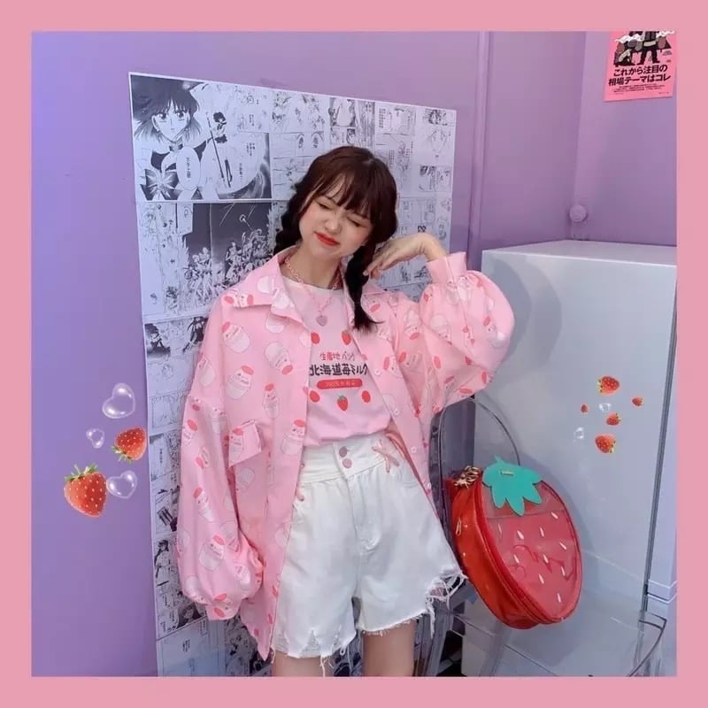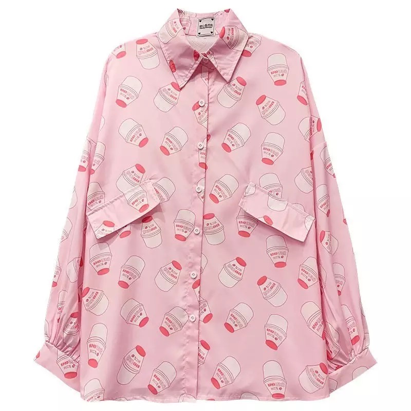 Cute Pastel Pink Strawberry Milk Yogurt Drink Blouse Long Sleeve Shirt Button Up Top Summer Casual E-Girl Kawaii Korean Japanese Harajuku Streetwear