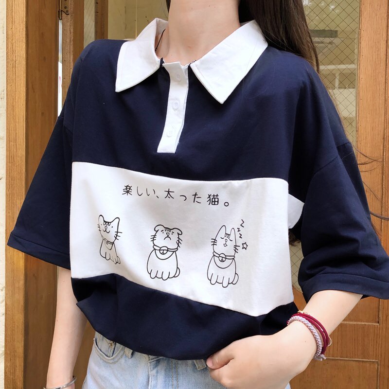 Cute Cat Dog Animal Print College Loose Baggy Short Sleeve Shirt T-shirt Top Summer Casual E-Girl Kawaii Korean Japanese Harajuku Streetwear
