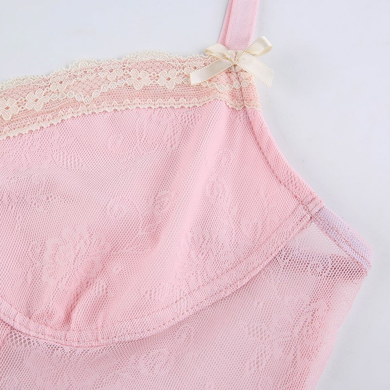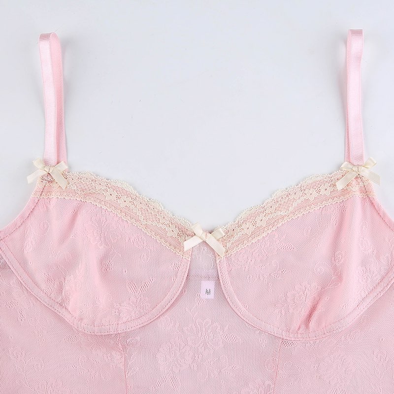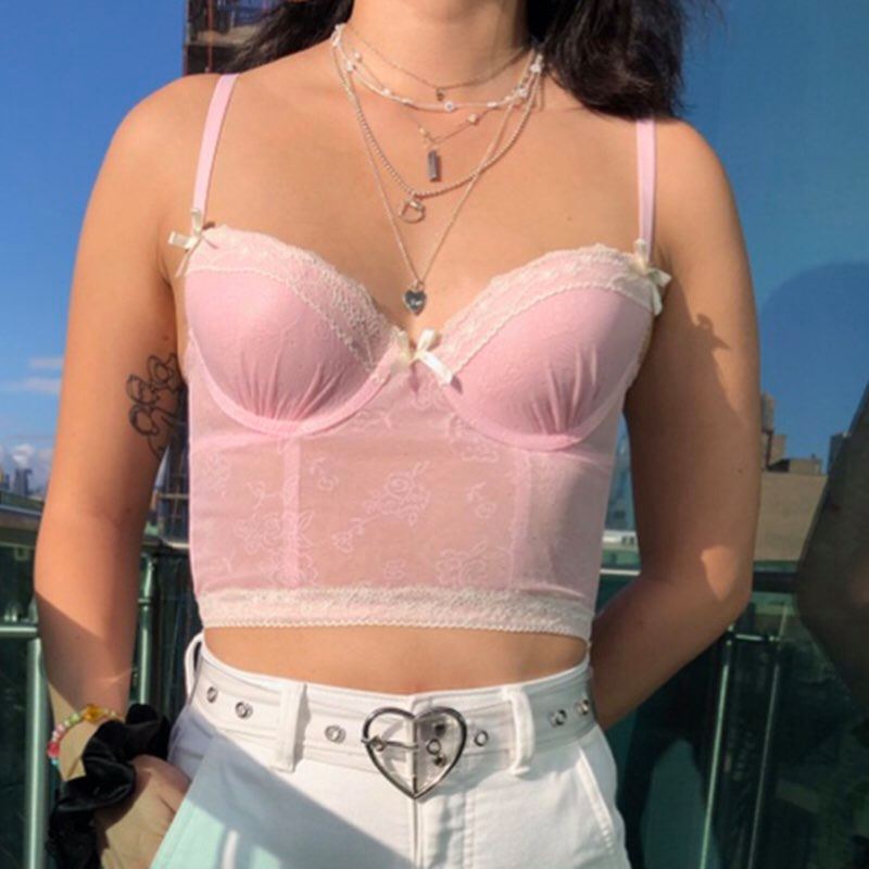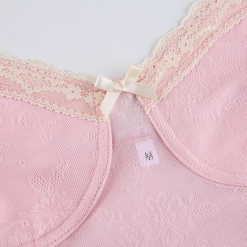 Cute Sexy Pink Sweet Lace Trim Bow Crop Top V Neck Transparent Sleeveless Shirt Summer Party E-Girl Kawaii Korean Japanese Harajuku Streetwear