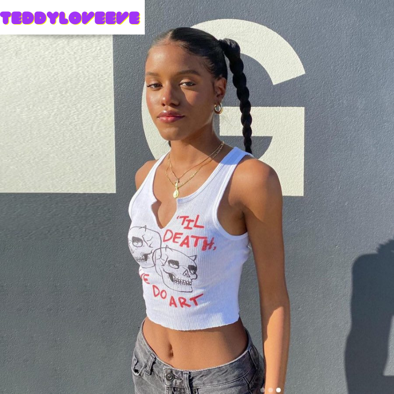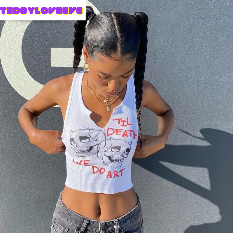 Cute Sexy White Skull Ribbed Sleeveless Tank Crop Top T-shirt Punk Goth Aesthetic Summer Party E-Girl Kawaii Korean Japanese Harajuku Streetwear