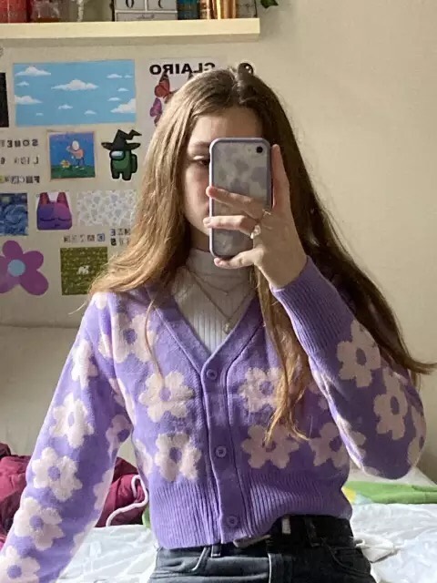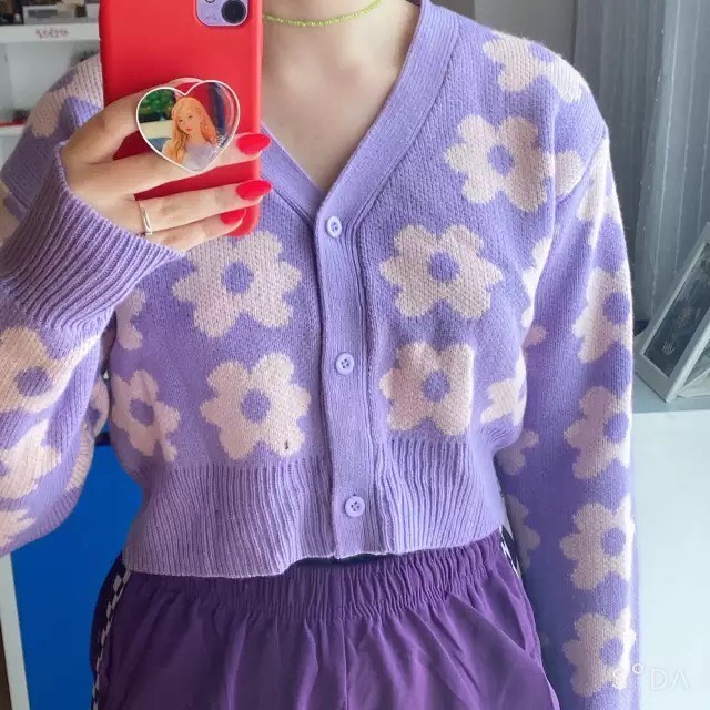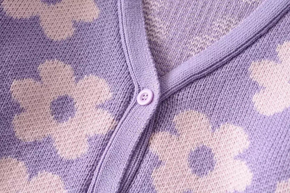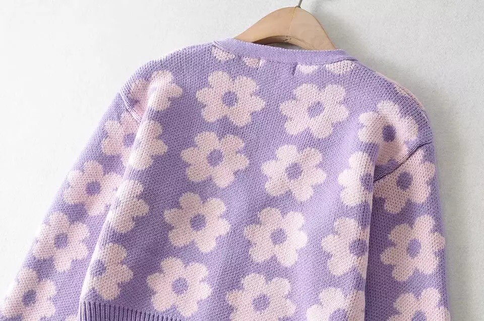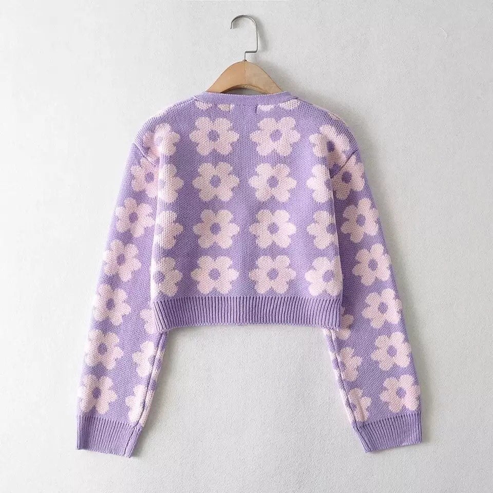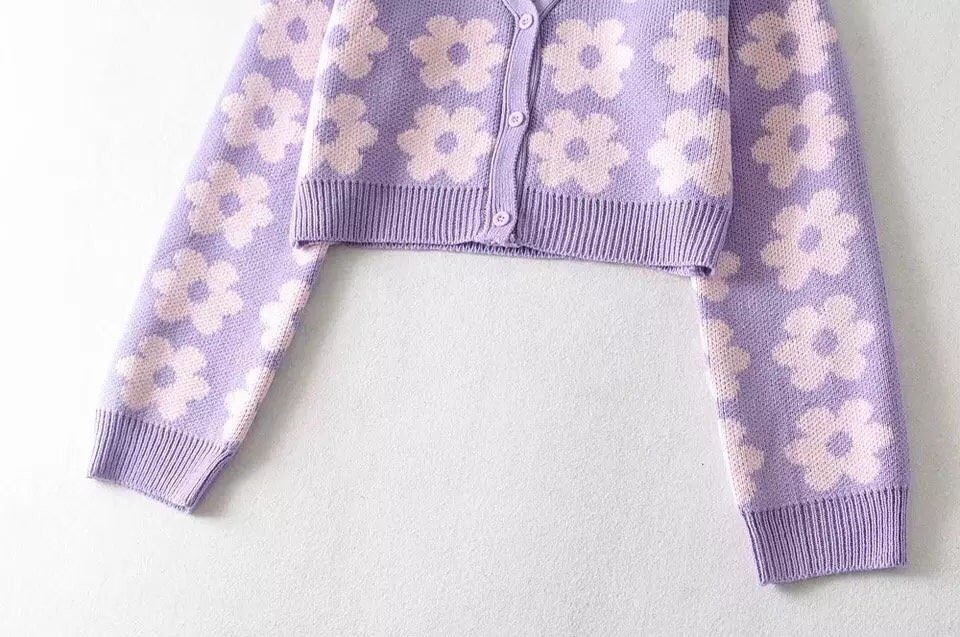 Cute Vintage 90s Purple Pink Flowers Cardigan Long Sleeve Shirt Top V Neck Sweater Jumper Aesthetic E-Girl Kawaii Korean Japanese Harajuku Streetwear