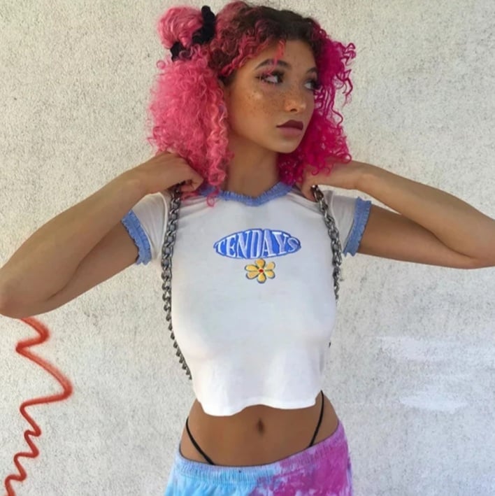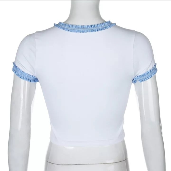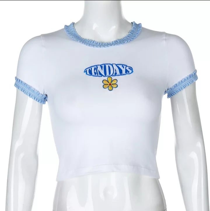 Cute Blue Lace Letter Embroidery Floral Print Short Sleeve Shirt Crop Top Aesthetic Casual Summer E-Girl Kawaii Korean Japanese Harajuku Streetwear