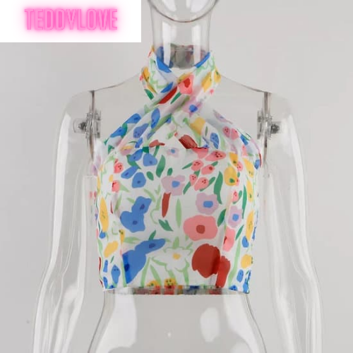 Cute Sexy Floral Print Halter Neck Tank Crop Top Backless Sleeveless Shirt Beach Aesthetic Casual Summer E-Girl Kawaii Korean Japanese Haraju