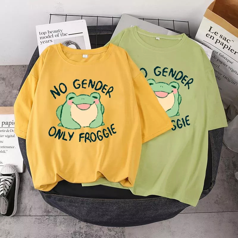 Cute Green Frog No Gender Funny Cartoon Print Short Sleeve T-shirt Oversize Loose Aesthetic Casual Summer E-Girl Kawaii Korean Japanese Haraju