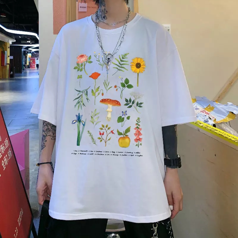 Cute Herbology Plant Mushroom Cartoon Print Loose Oversize Short Sleeve T-shirt Punk Aesthetic Casual Summer E-Girl Kawaii Korean Japanese Harajuku