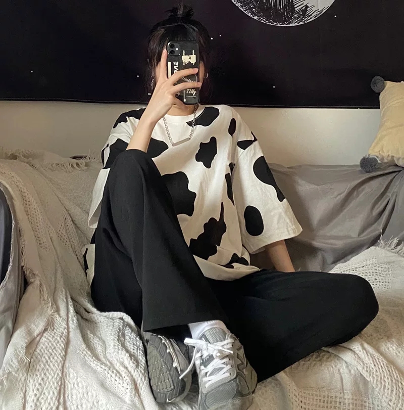 Cute Cow Anime Print Oversized Loose Short Sleeve T-shirt Punk Goth Aesthetic Casual Summer E-Girl Kawaii Korean Japanese Harajuku Streetwear