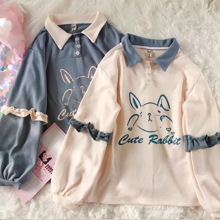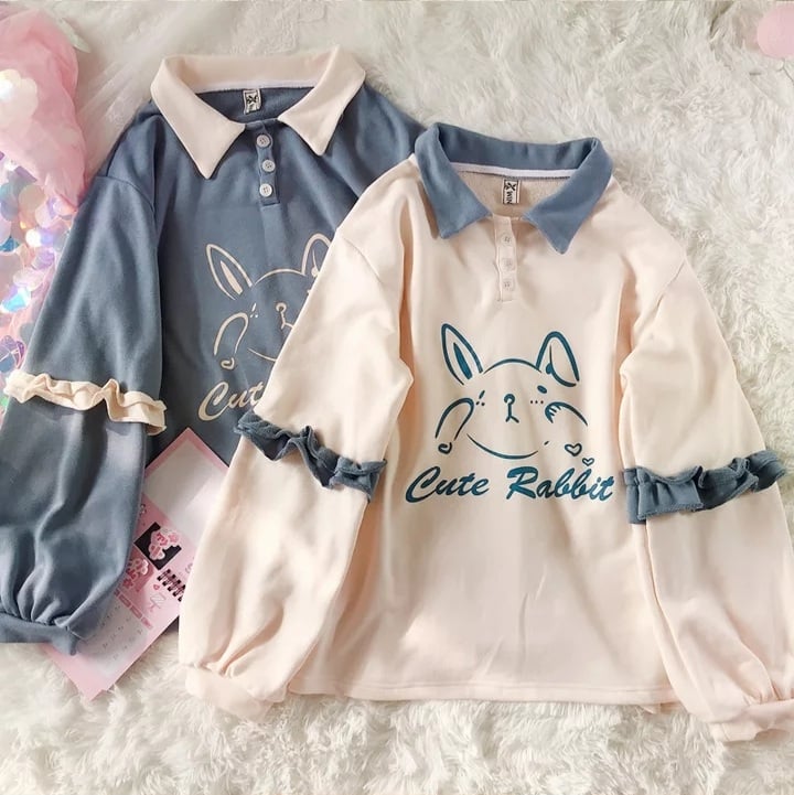 Cute Bunny Rabbit Graphic Vintage Collar Long Sleeve T- Shirt Sweatshirt Aesthetic Casual E-Girl Kawaii Korean Japanese Harajuku