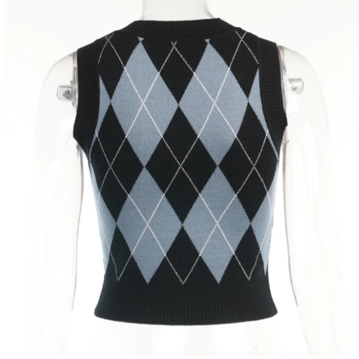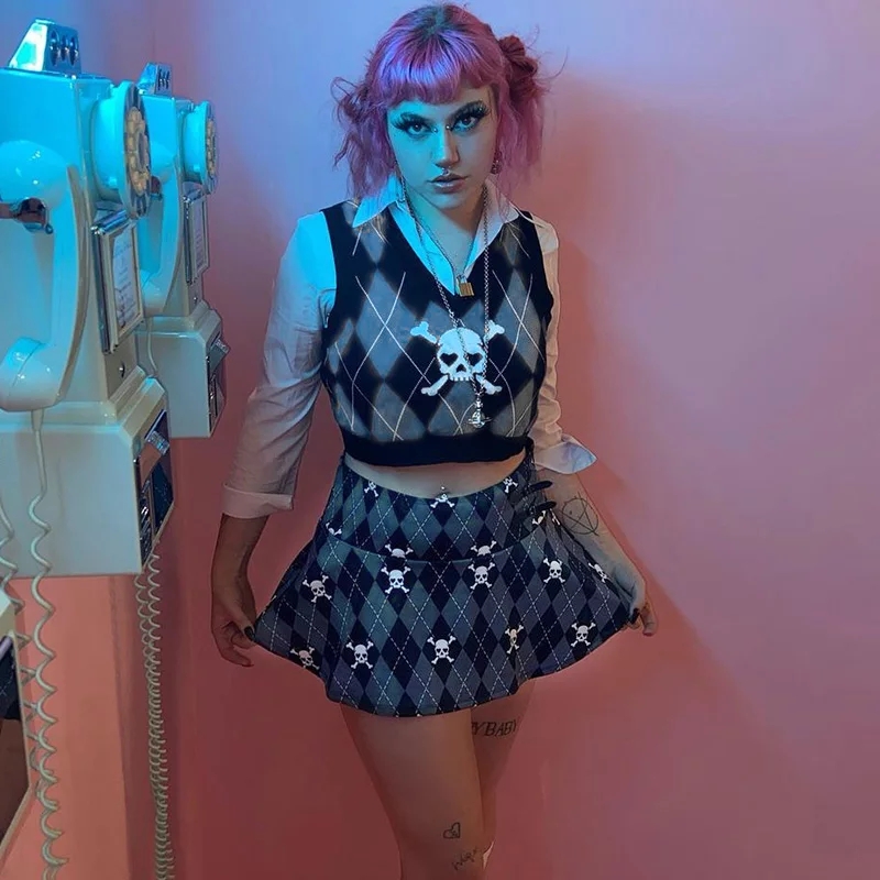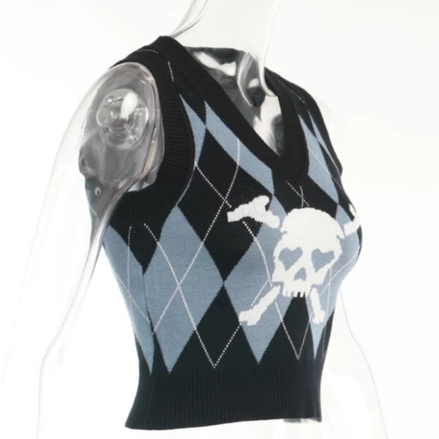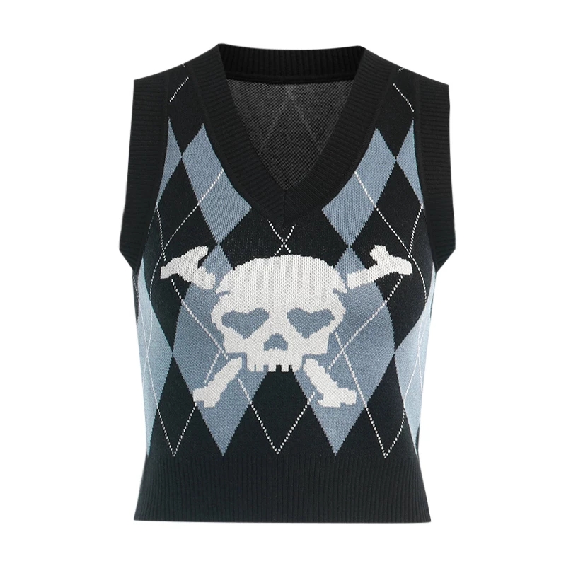 Cute Sexy V Neck Skull Print Knit Vest Sleeveless Crop Top Punk Goth Aesthetic Casual Summer E-Girl Kawaii Korean Japanese Harajuku