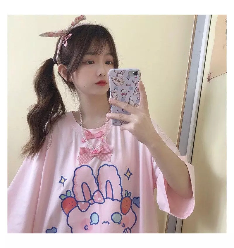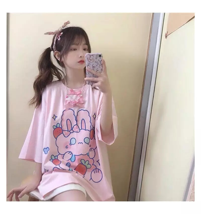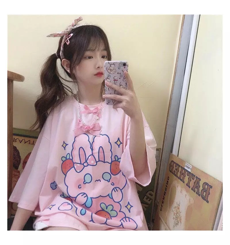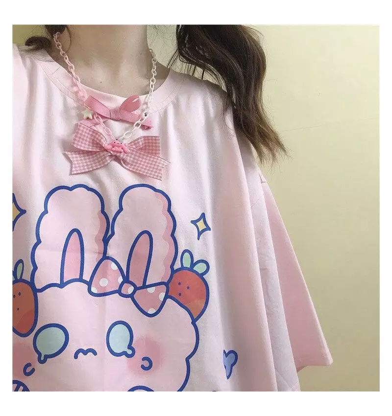 Cute Pastel Pink Sweet Rabbit Crying Strawberry Print Oversized Short Sleeve Shirt Aesthetic Casual E-Girl Kawaii Korean Japanese Harajuku