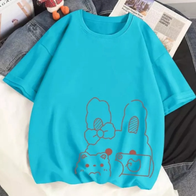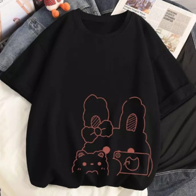 Cute Rabbit Bunny Camera Graphic Cartoon Print Loose Short Sleeve T-shirt Aesthetic Casual Summer E-Girl Kawaii Korean Japanese Harajuku