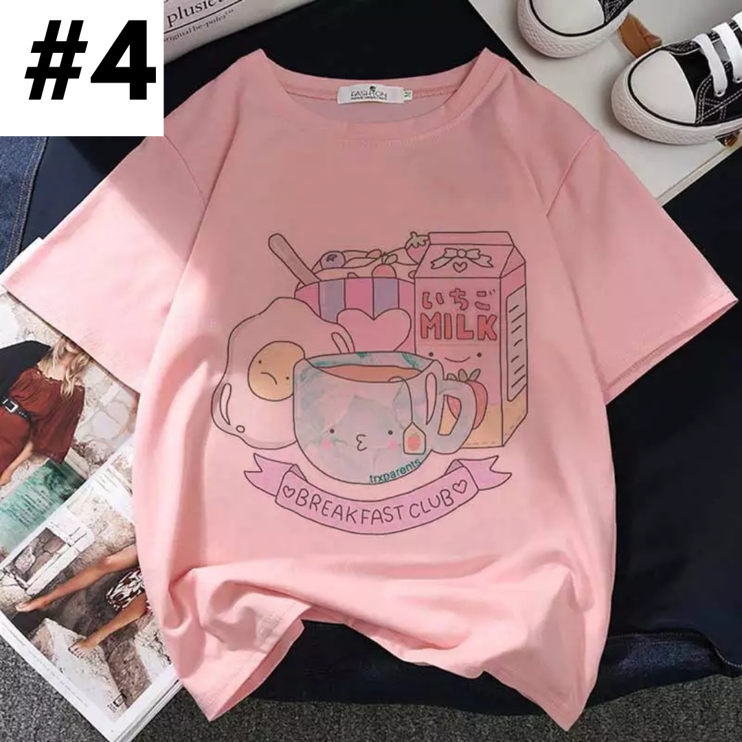 Cute Pastel Pink Strawberry Peach Juice Cartoon Print Loose Short Sleeve Shirt Aesthetic Casual E-Girl Kawaii Korean Japanese Harajuku