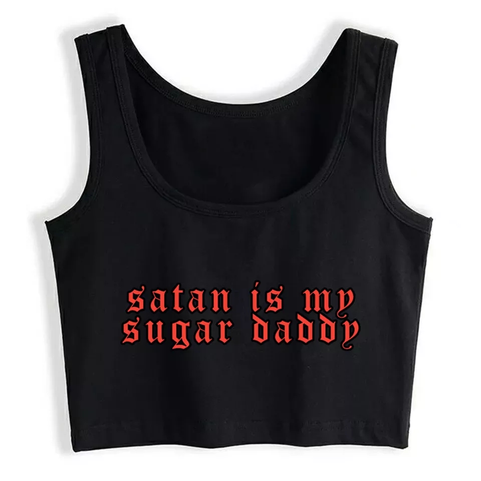 Cute Black Satan Sugar Daddy Print Crop Top Tank Sleeveless Shirt Aesthetic Casual E-Girl Kawaii Korean Japanese Harajuku