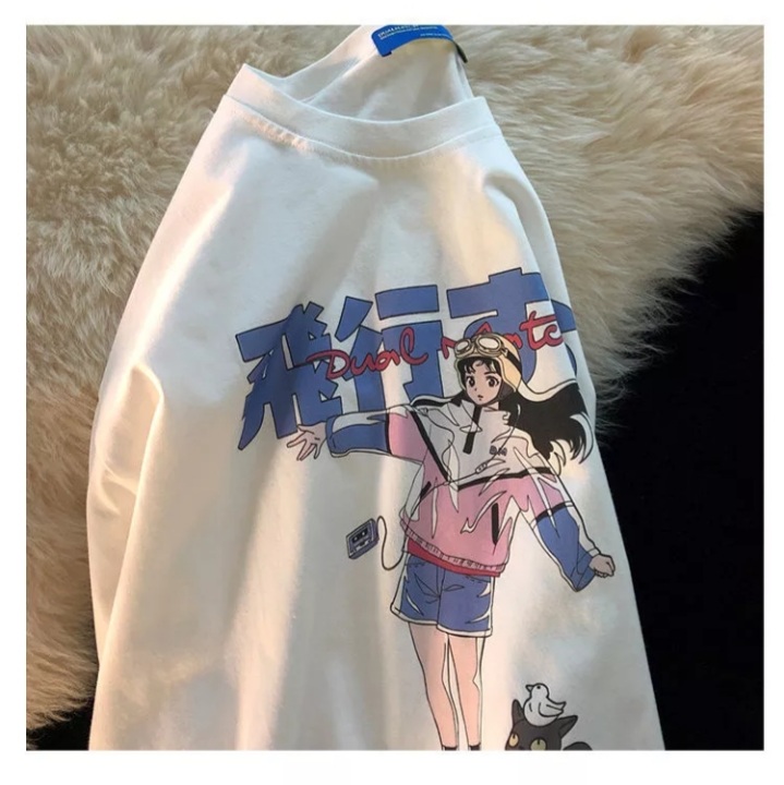 Cute White Graffiti Anime Girl Cat Cartoon Print Oversized Short Sleeve Shirt Punk Aesthetic Casual E-Girl Kawaii Korean Japanese Harajuku