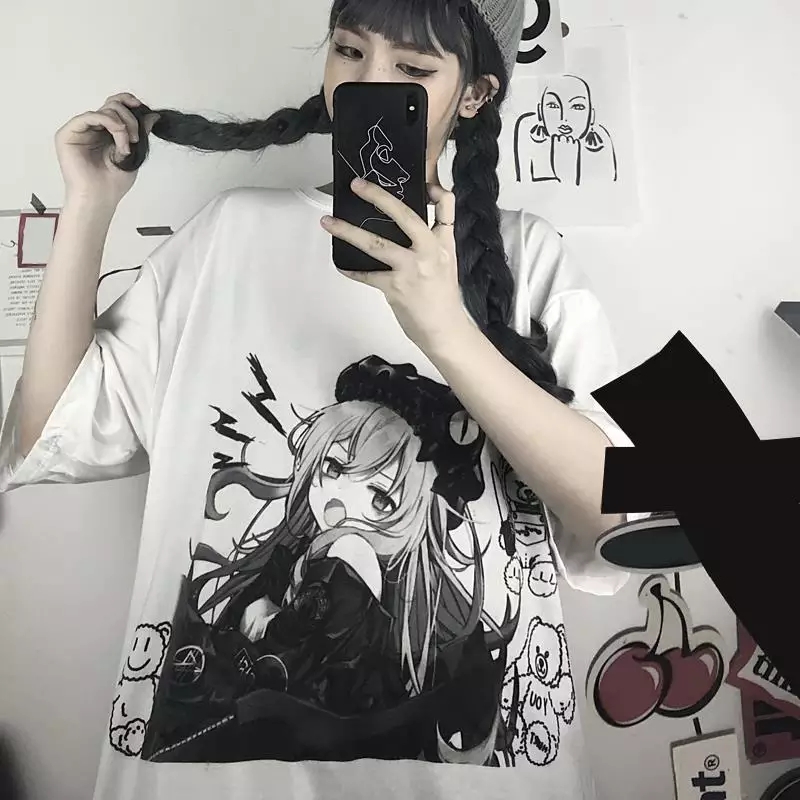 Cute White Anime Girl Graphic Print Loose Short Sleeve Shirt Goth Punk Aesthetic Casual E-Girl Kawaii Korean Japanese Harajuku