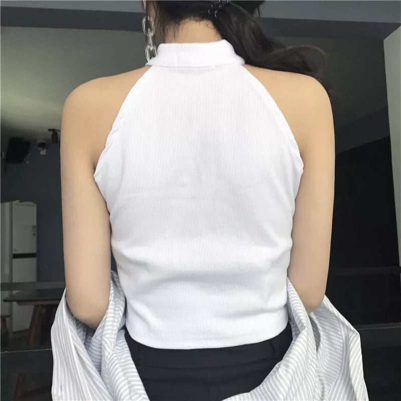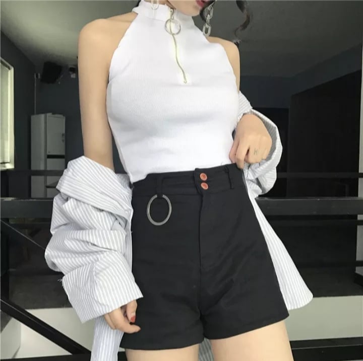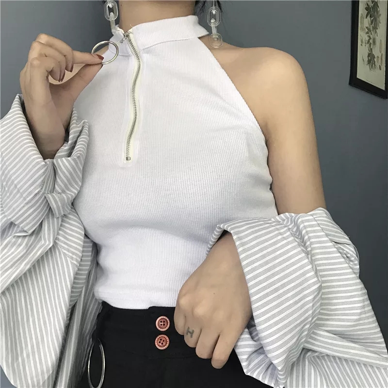 Cute Black White Sexy Knit Zipper Sleeveless Shirt Crop Top Tank Camisole Aesthetic Casual E-Girl Kawaii Korean Japanese Harajuku
