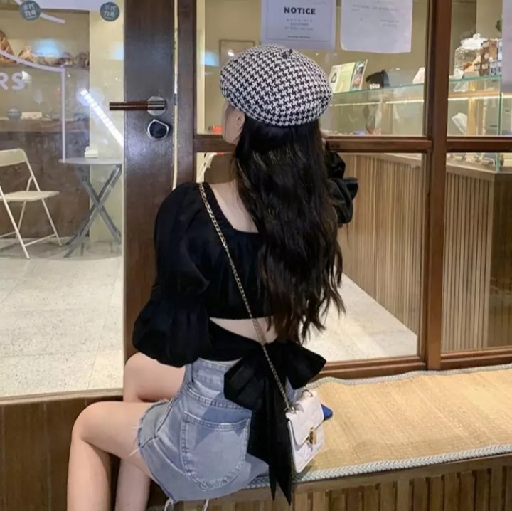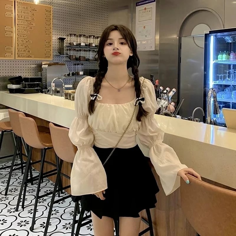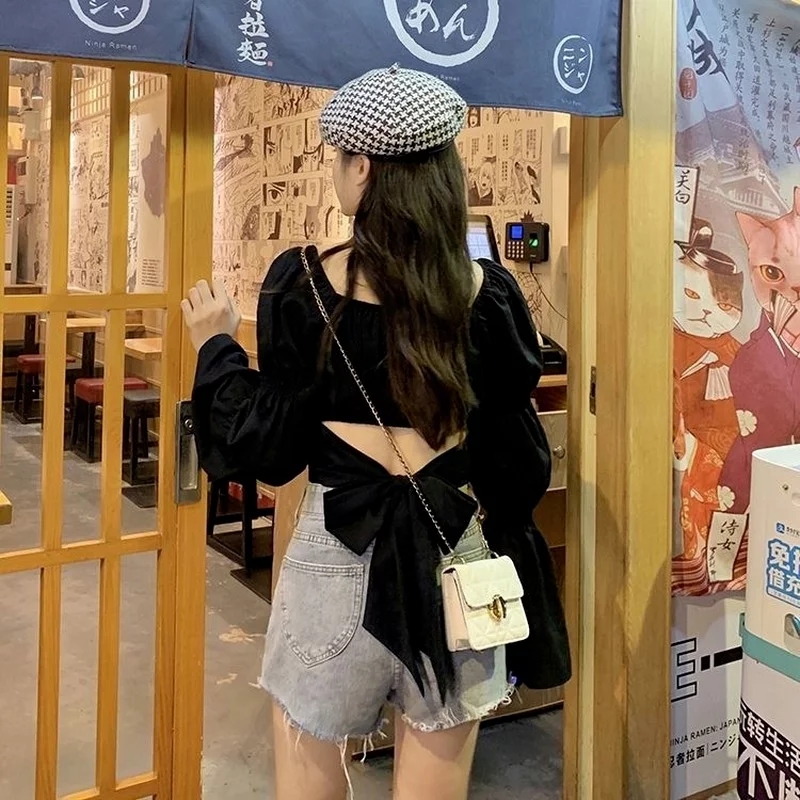 Cute Pink Back Puff Sleeve French Bow Bandage Long Sleeve Shirt Blouse Crop Top Square Neck Aesthetic Casual E-Girl Kawaii Korean Japanese Harajuku