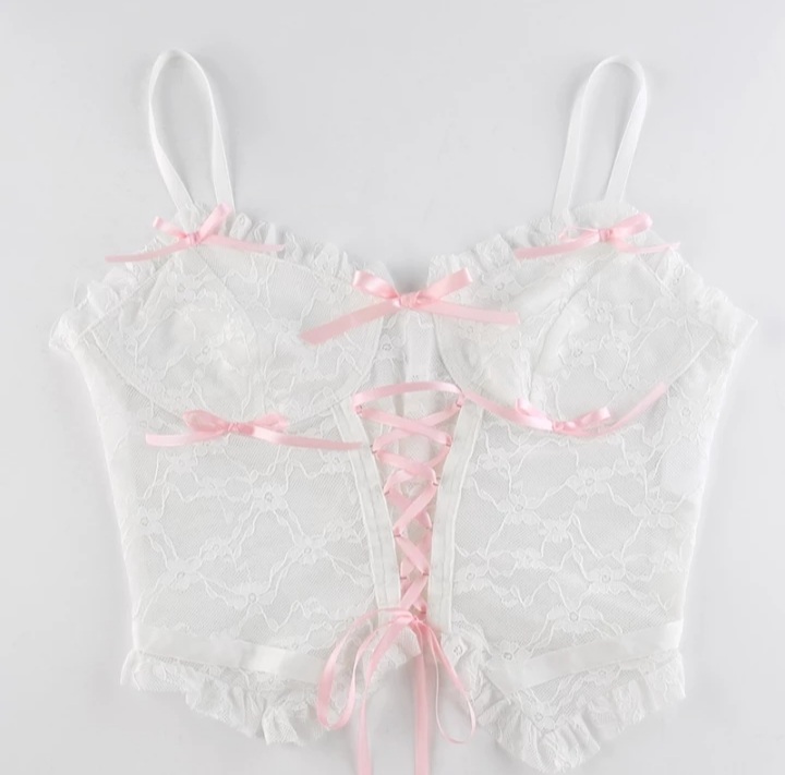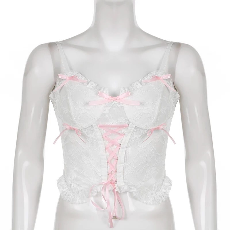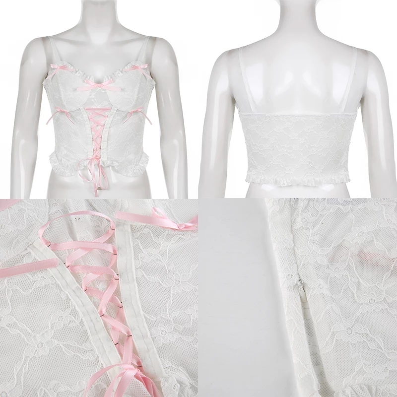 Cute Lace Mesh Patchwork Transparent Corset Camisole Ruffle Crop Top Sleeveless Shirt Summer Aesthetic Casual E-Girl Kawaii Korean Japanese Harajuku