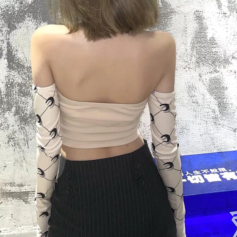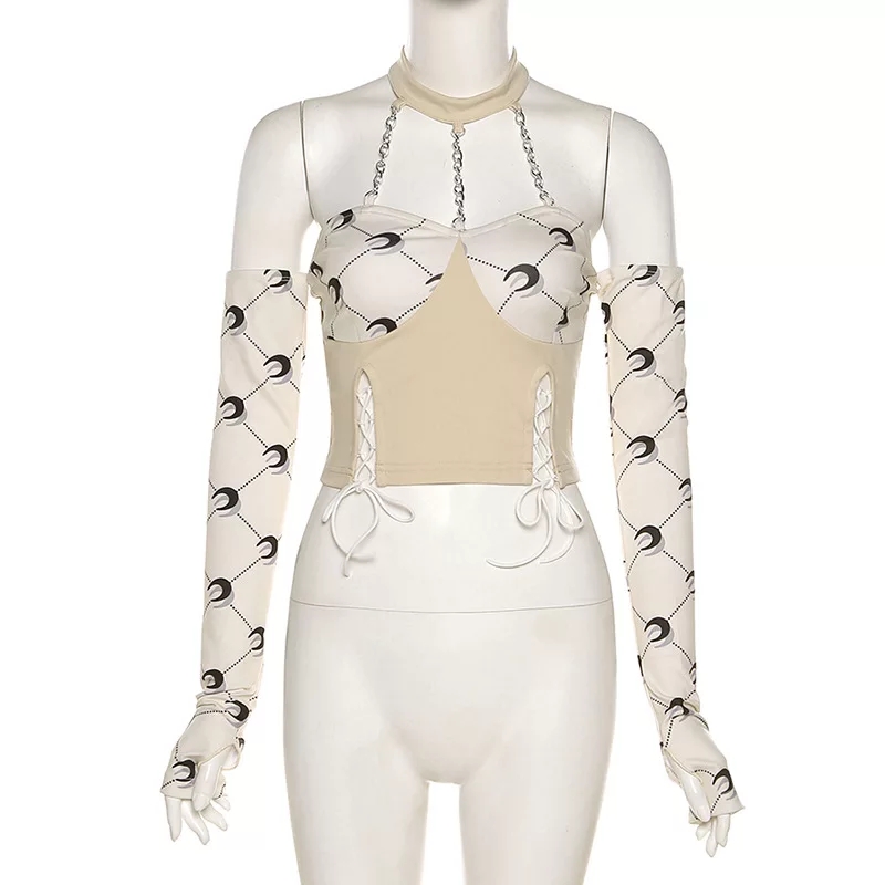 Cute Moon Print Patchwork Bandage Bustier Chain Halter Crop Top Off Shoulder Long Sleeve Shirt Aesthetic E-Girl Kawaii Korean Japanese Harajuku