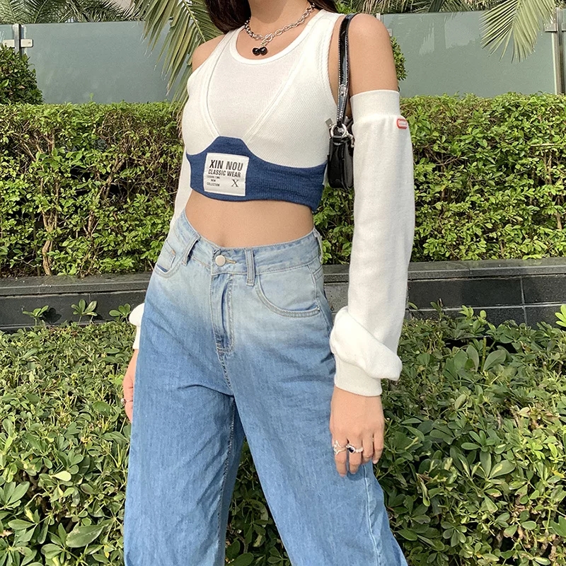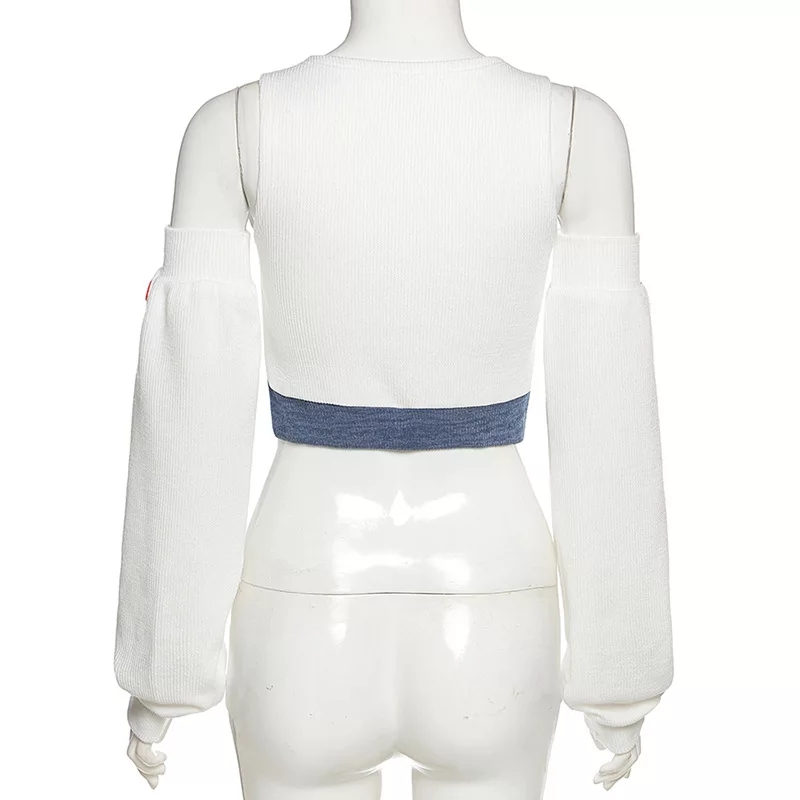 Cute Patchwork Letter Label T-shirt Separate Sleeve Crop Top Bodycon Streetwear Summer Aesthetic Casual E-Girl Kawaii Korean Japanese Harajuku