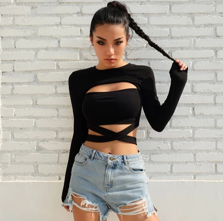 Cute Black Criss Cross Bandage Hallow Out Long Sleeve T-shirt Crop Top Summer Aesthetic Casual E-Girl Kawaii Korean Japanese Harajuku
