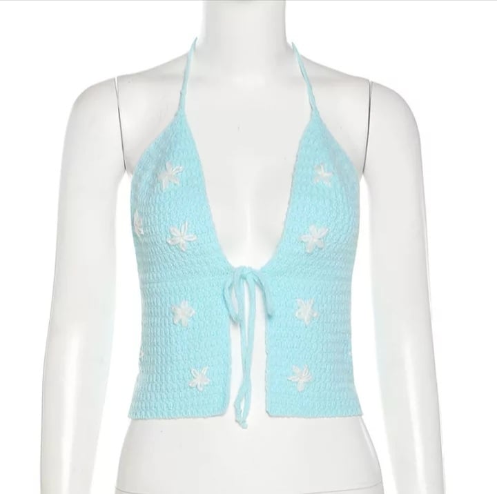 Cute Sexy Blue Crochet Knit Floral Backless Crop Top Tank Camisole Halter Beach Party Summer Aesthetic Casual E-Girl Kawaii Korean Japanese Harajuku