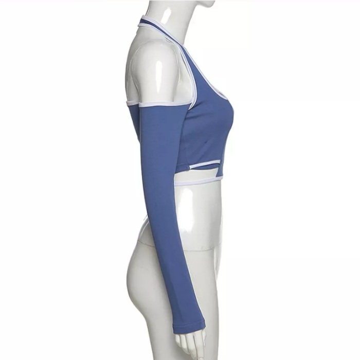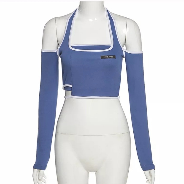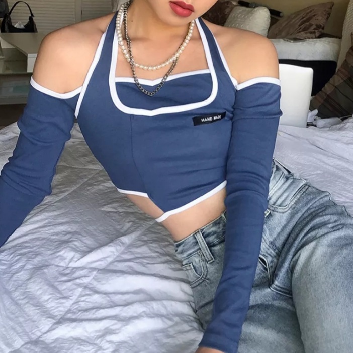 Blue Patchwork Halter Off Shoulder Hollow Crop Top Long Sleeve T-shirt Streetwear Summer Aesthetic Casual E-Girl Kawaii Korean Japanese Harajuku