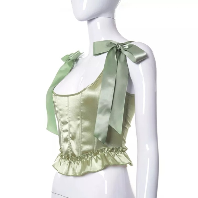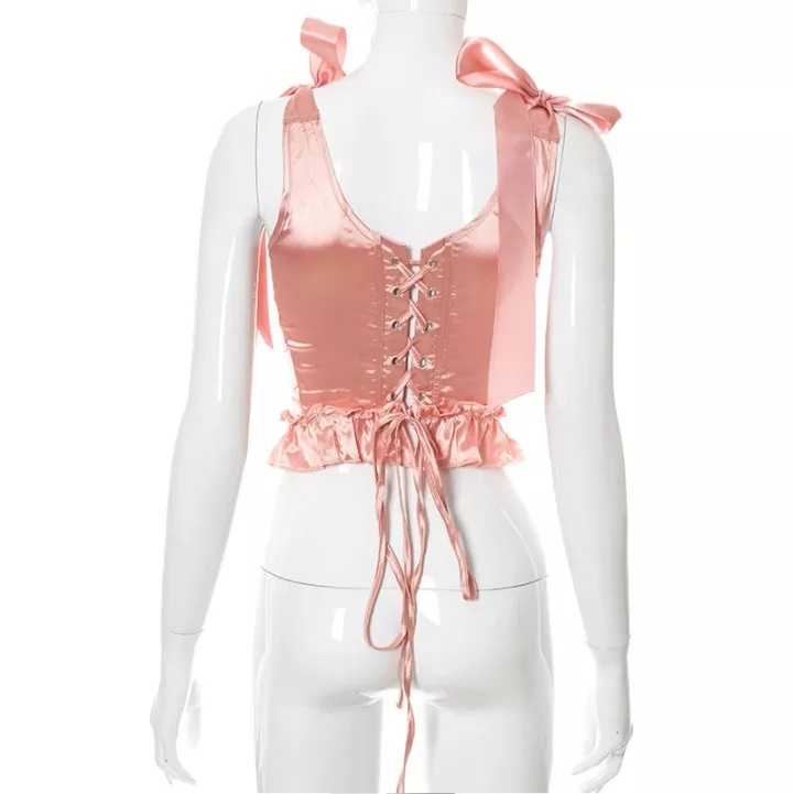 Cute Lace Ribbon Bow Tie Solid Square Collar Patchwork Sleeveless Corset Top Summer Aesthetic Casual E-Girl Kawaii Korean Japanese Harajuku