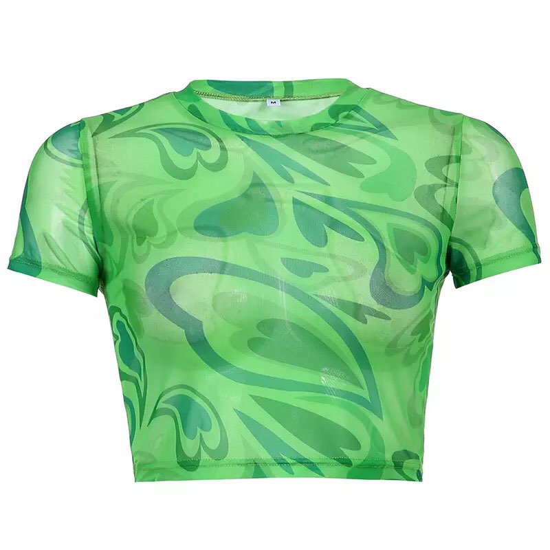 Green Heart Print Transparent Mesh Sheer Crop Top Short Sleeve Shirt Summer Aesthetic Casual E-Girl Kawaii Korean Japanese Harajuku