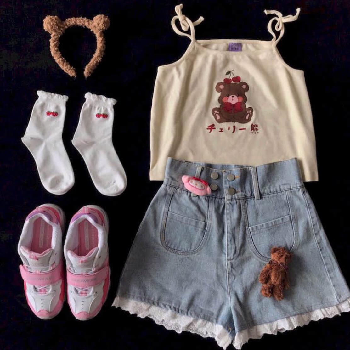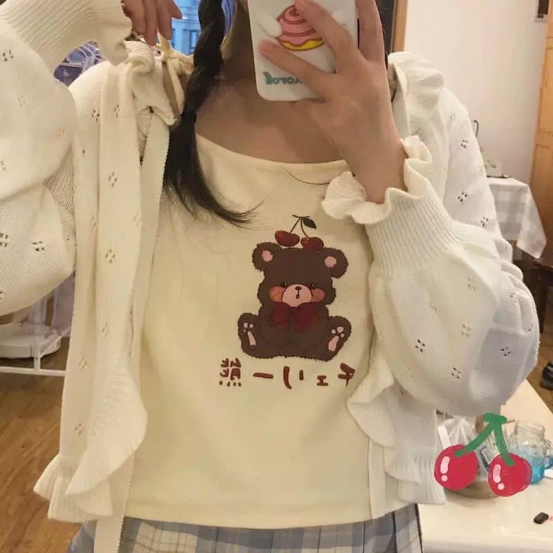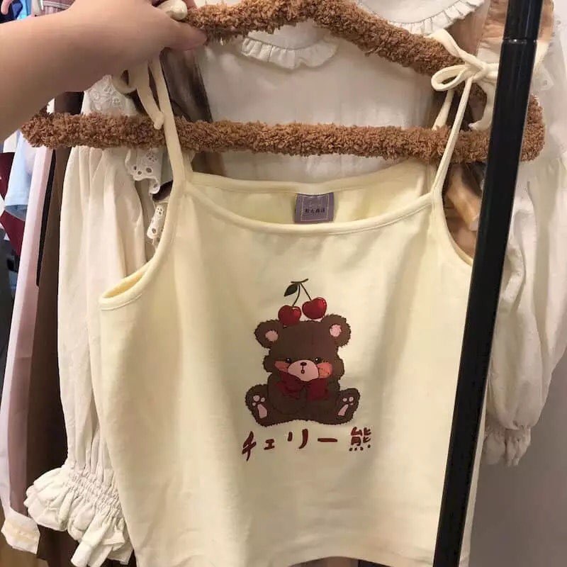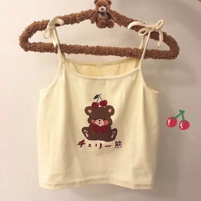 Cute Brown Bear Cherry Graphic Cartoon Print Camisole Spaghetti Strap Shirt Aesthetic Casual Summer E-Girl Kawaii Korean Japanese Harajuku