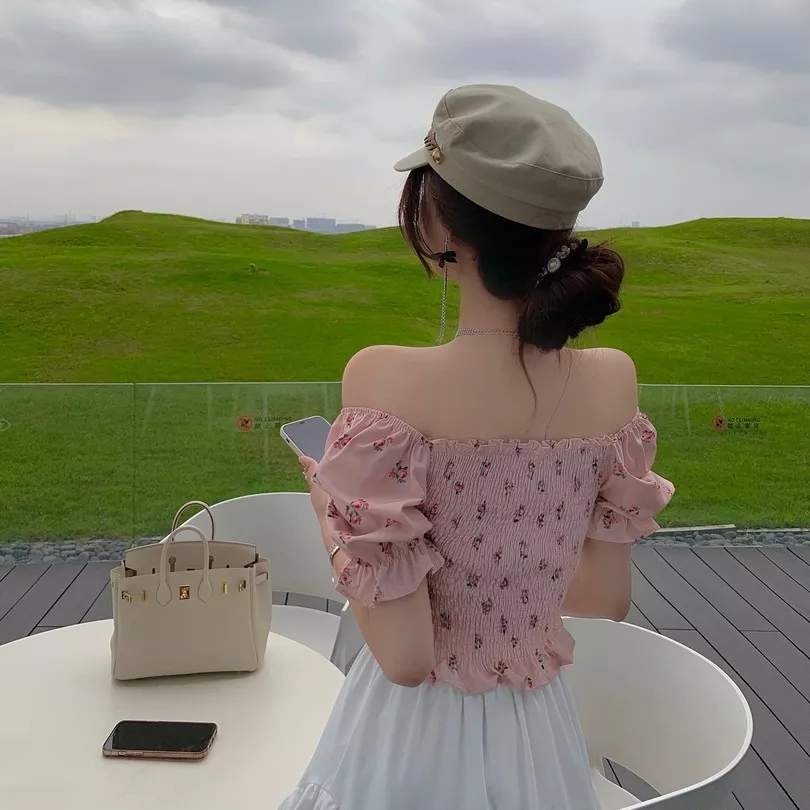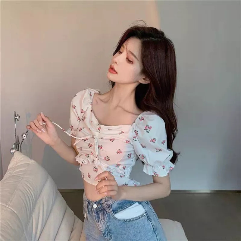Sweet Floral Bow Pleated Puff Sleeve Blouse Aesthetic Casual E-Girl Kawaii Korean Japanese Harajuku